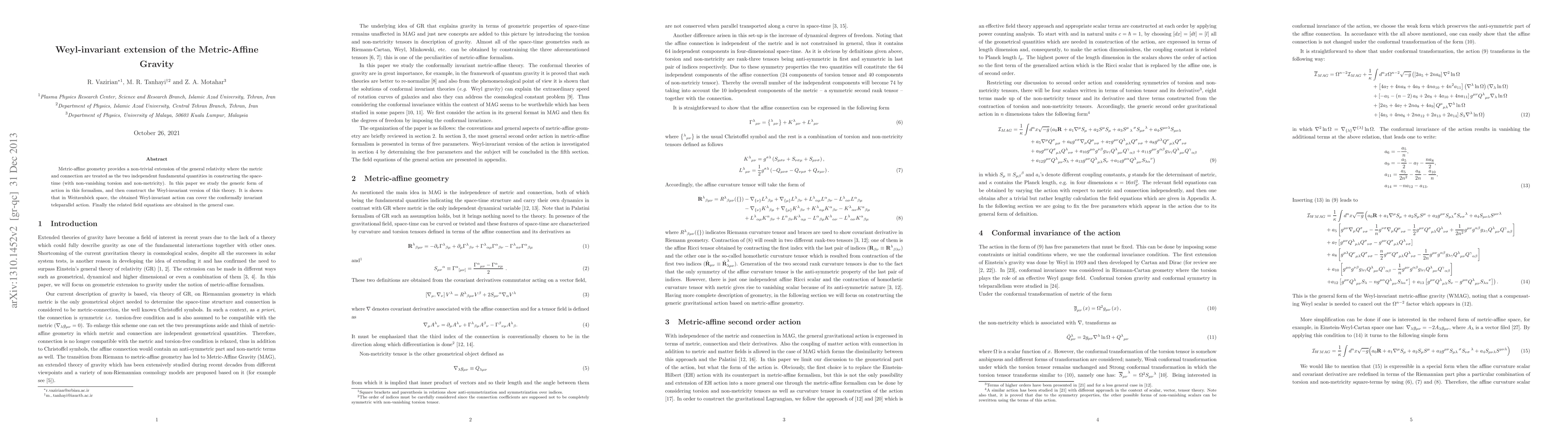 The paper presents a detailed construction of the Weyl-invariant metric-affine gravity action, demonstrating its reduction to a conformally invariant teleparallel action in Weitzenbock space.