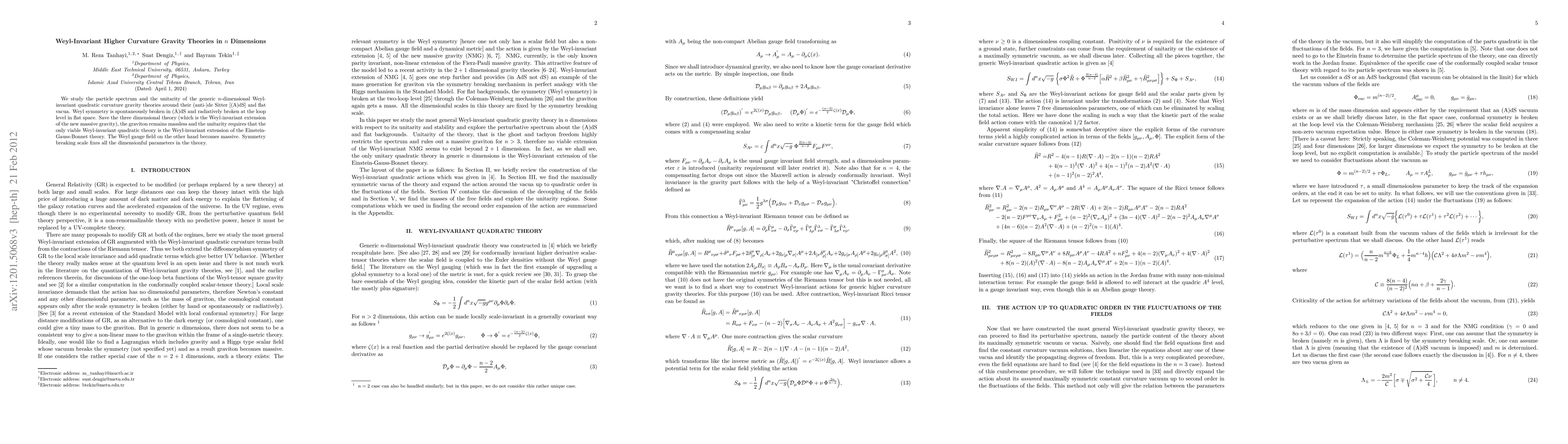 This paper investigates the particle spectrum and unitarity of n-dimensional Weyl-invariant quadratic curvature gravity theories, finding that the graviton remains massless except in three dimensions. The only viable Weyl-invariant theory is the extension of the Einstein-Gauss-Bonnet theory, while the Weyl gauge field becomes massive, with symmetry breaking scale determining all dimensionful parameters.
