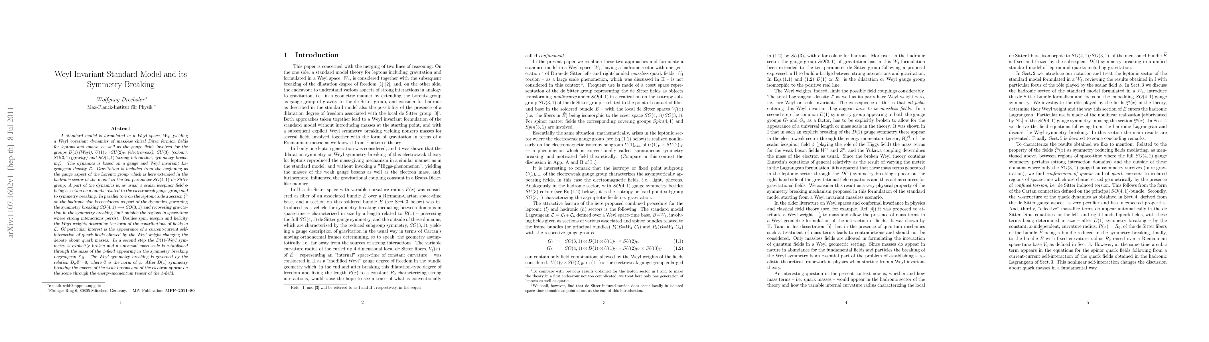 A standard model is formulated in a Weyl space, $W_4$, yielding a Weyl covariant dynamics of massless chiral Dirac fermion fields for leptons and quarks as well as the gauge fields involved for the groups D(1)\,(Weyl), $U(1)_Y{\times} SU(2)_W$\,(electroweak), $SU(3)_c$\,(colour), SO(3,1)\,(gravity) and SO(4,1)\,(strong interaction, symmetry breaking). The dynamics is based on a gauge and Weyl invariant Lagrangean density ${\cal L}$. Gravitation is included from the beginning as the gauge aspect of the Lorentz group which is here extended in the hadronic sector of the model to the ten parameter SO(4,1) de Sitter group. A part of the dynamics is, as usual, a scalar isospinor field $\phi$ being a section on a bundle related to the electroweak gauge group and to symmetry breaking. In parallel to $\phi$ on the leptonic side a section $\tilde\xi^a$ on the hadronic side is considered as part of the dynamics, governing the symmetry breaking $SO(4,1)\longrightarrow SO(3,1)$ and recovering gravitation in the symmetry breaking limit outside the regions in space-time where strong interactions persist. Besides spin, isospin and helicity the Weyl weights determine the form of the contributions of fields in ${\cal L}$. Of particular interest is the appearance of a current-current self-interaction of quark fields allowed by the Weyl weight changing the debate about quark masses. In a second step the D(1)-Weyl symmetry is explicitly broken and a universal mass scale is established through the mass of the $\phi$-field appearing in the symmetry breaking Lagrangean ${\cal L}_B$. The Weyl symmetry breaking is governed by the relation $D_\mu \Phi^2{=}0$, where $\Phi$ is the norm of $\phi$. After D(1) symmetry breaking the masses of the weak bosons and of the electron appear on the scene through the energy-momentum tensor of the $\phi$-field.