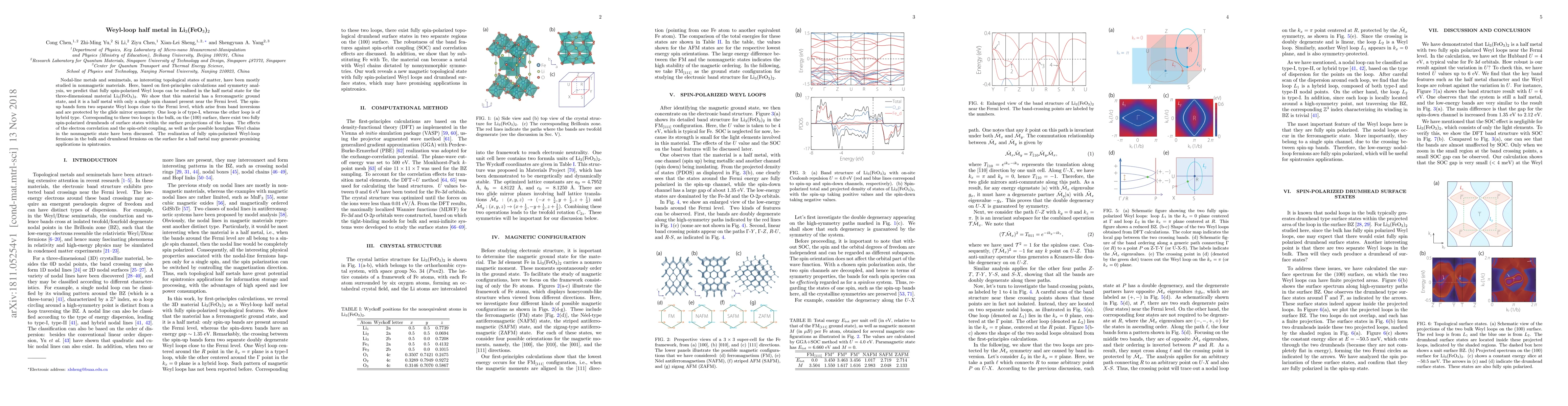 This research predicts that Li$_3$(FeO$_3$)$_2$ exhibits a Weyl-loop half-metal state with fully spin-polarized Weyl loops and drumhead surface states, potentially enabling advanced spintronics applications. The material's ferromagnetic ground state and unique band structure support these topological features.