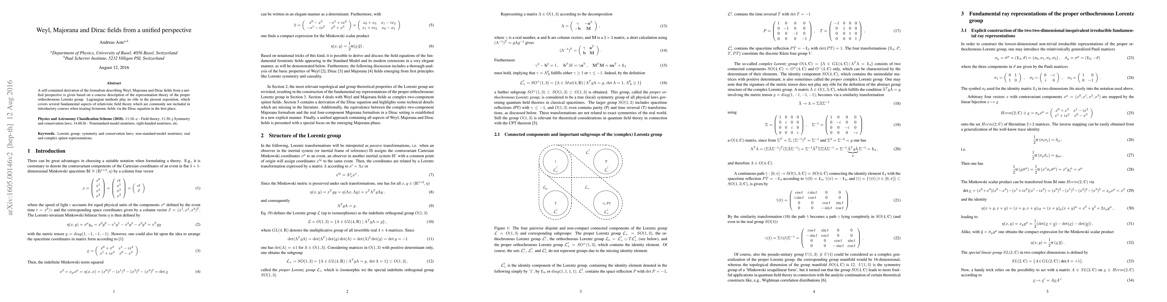 A self-contained derivation of the formalism describing Weyl, Majorana and Dirac fields from a unified perspective is given based on a concise description of the representation theory of the proper orthochronous Lorentz group. Lagrangian methods play no role in the present exposition, which covers several fundamental aspects of relativistic field theory which are commonly not included in introductory courses when treating fermionic fields via the Dirac equation in the first place.