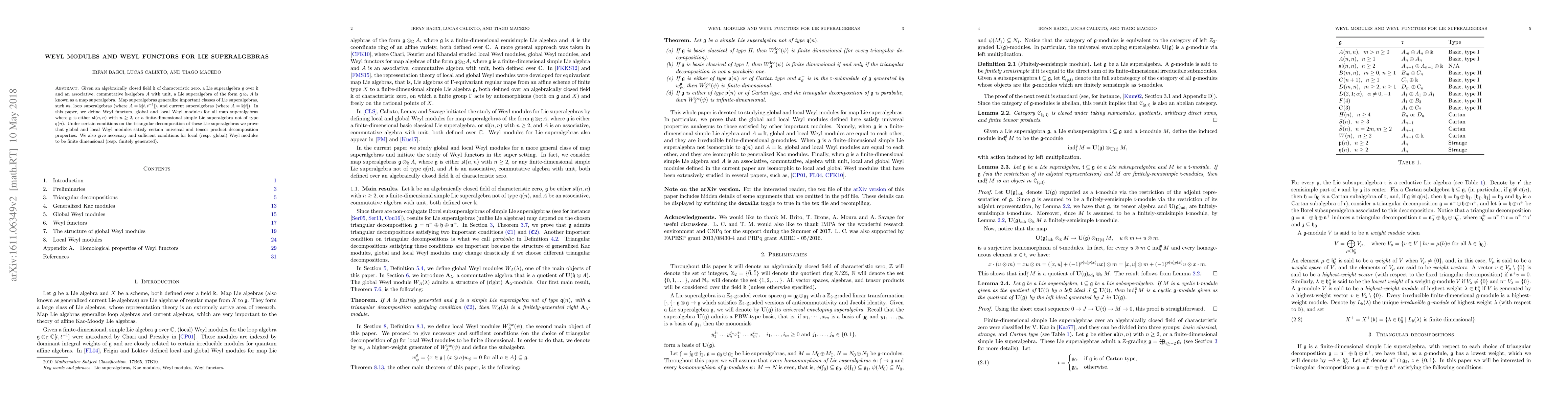 Given an algebraically closed field $\Bbbk$ of characteristic zero, a Lie superalgebra $\mathfrak{g}$ over $\Bbbk$ and an associative, commutative $\Bbbk$-algebra $A$ with unit, a Lie superalgebra of the form $\mathfrak{g} \otimes_\Bbbk A$ is known as a map superalgebra. Map superalgebras generalize important classes of Lie superalgebras, such as, loop superalgebras (where $A=\Bbbk[t, t^{-1}]$), and current superalgebras (where $A=\Bbbk[t]$). In this paper, we define Weyl functors, global and local Weyl modules for all map superalgebras where $\mathfrak{g}$ is either $\mathfrak{sl} (n,n)$ with $n \ge 2$, or a finite-dimensional simple Lie superalgebra not of type $\mathfrak{q}(n)$. Under certain conditions on the triangular decomposition of these Lie superalgebras we prove that global and local Weyl modules satisfy certain universal and tensor product decomposition properties. We also give necessary and sufficient conditions for local (resp. global) Weyl modules to be finite dimensional (resp. finitely generated).