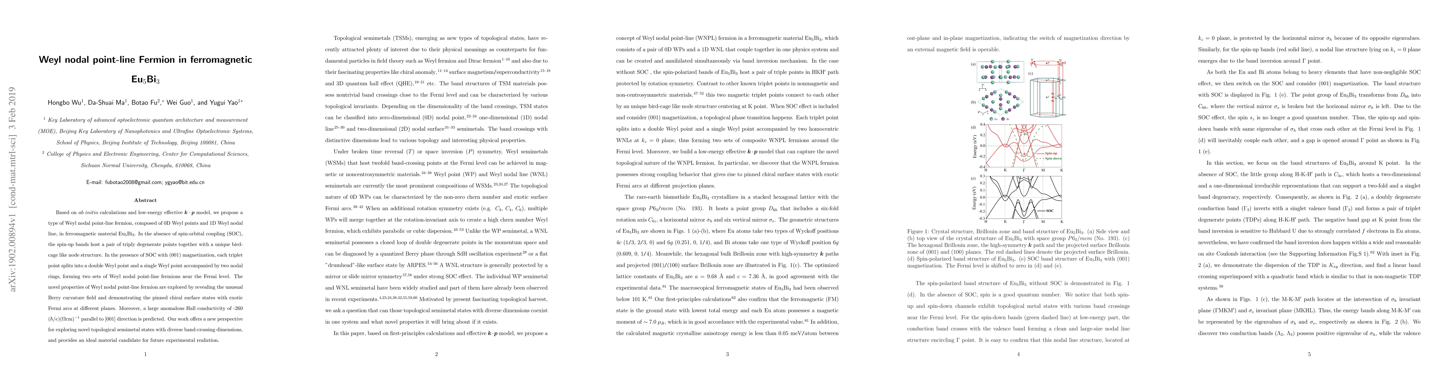 This paper proposes the existence of Weyl nodal point-line fermions in ferromagnetic Eu$_5$Bi$_3$ through $ab$ initio calculations and $k{\cdot}p$ models. The study reveals unique topological properties, including a large anomalous Hall conductivity, and suggests Eu$_5$Bi$_3$ as a promising material for future topological semimetal research.