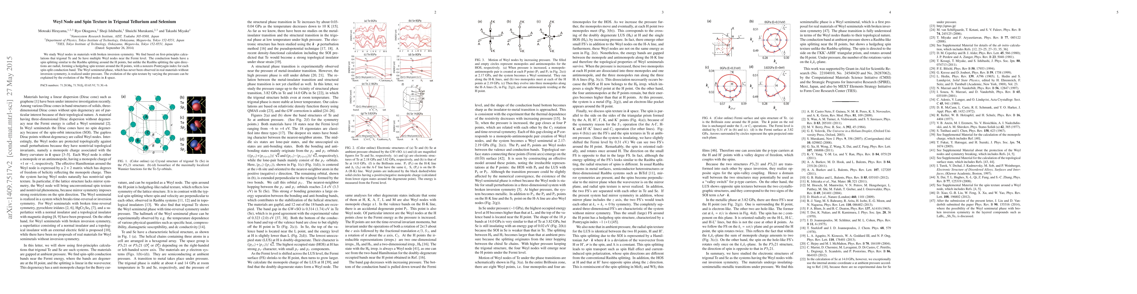 Trigonal tellurium and selenium exhibit multiple Weyl nodes near the Fermi level, characterized by radial spin textures resembling hedgehogs, driven by broken inversion symmetry. Under pressure, a Weyl semimetal phase emerges, with spin texture evolution reflecting the movement of Weyl nodes in k space.