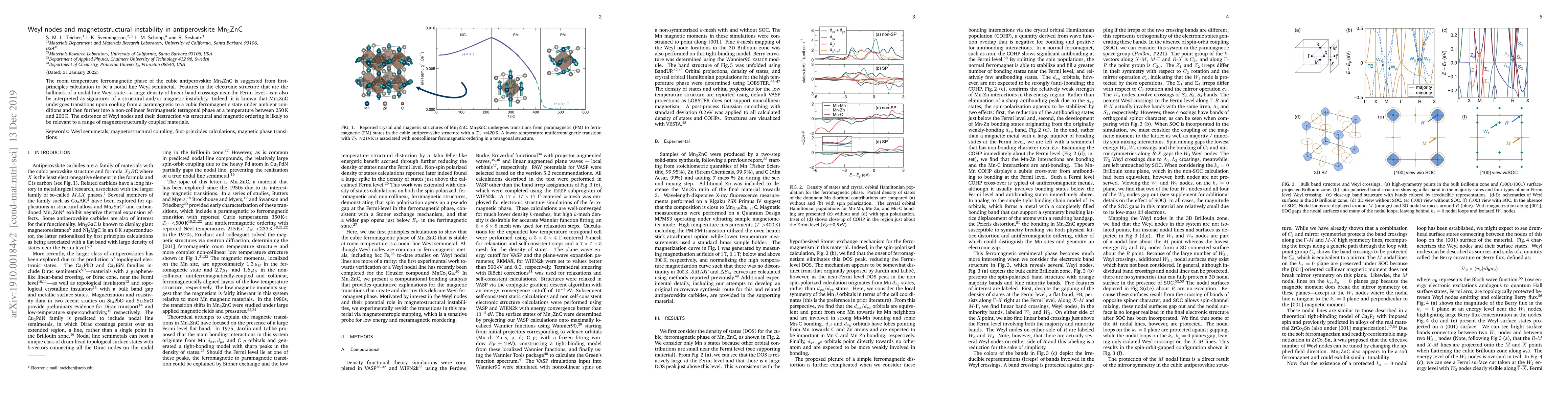 Researchers found that the ferromagnetic phase of Mn$_3$ZnC exhibits Weyl nodes, which are connected to magnetostructural instability. Cooling the material leads to a transition from paramagnetism to cubic ferromagnetism and further to non-collinear ferrimagnetism.