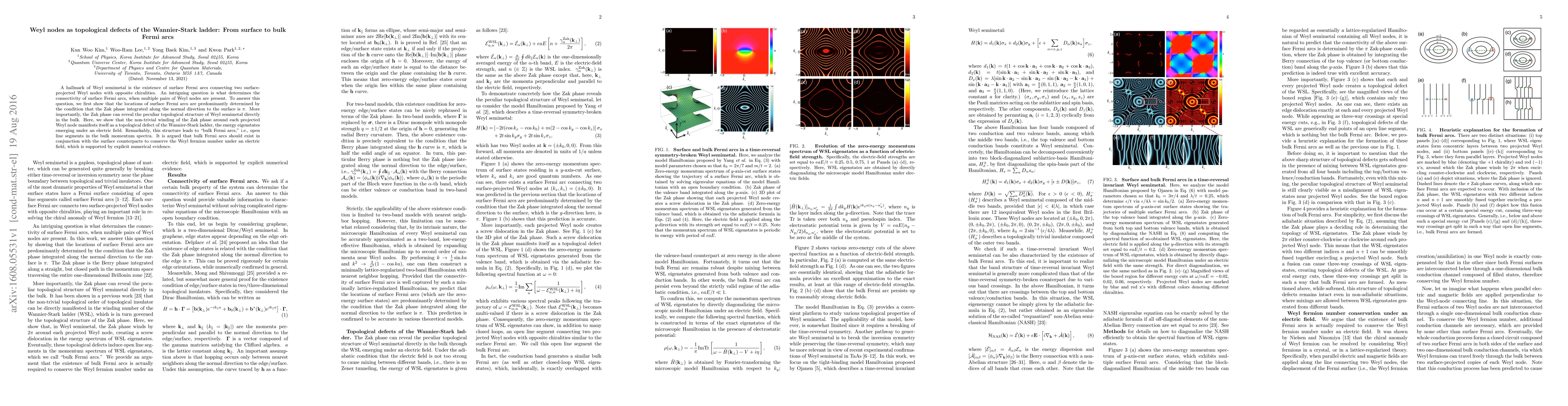 This paper investigates how the connectivity of surface Fermi arcs in Weyl semimetals is determined by the Zak phase, revealing a topological defect in the Wannier-Stark ladder that manifests as bulk Fermi arcs, maintaining Weyl fermion number conservation. Numerical evidence supports the presence of these bulk Fermi arcs alongside surface arcs.