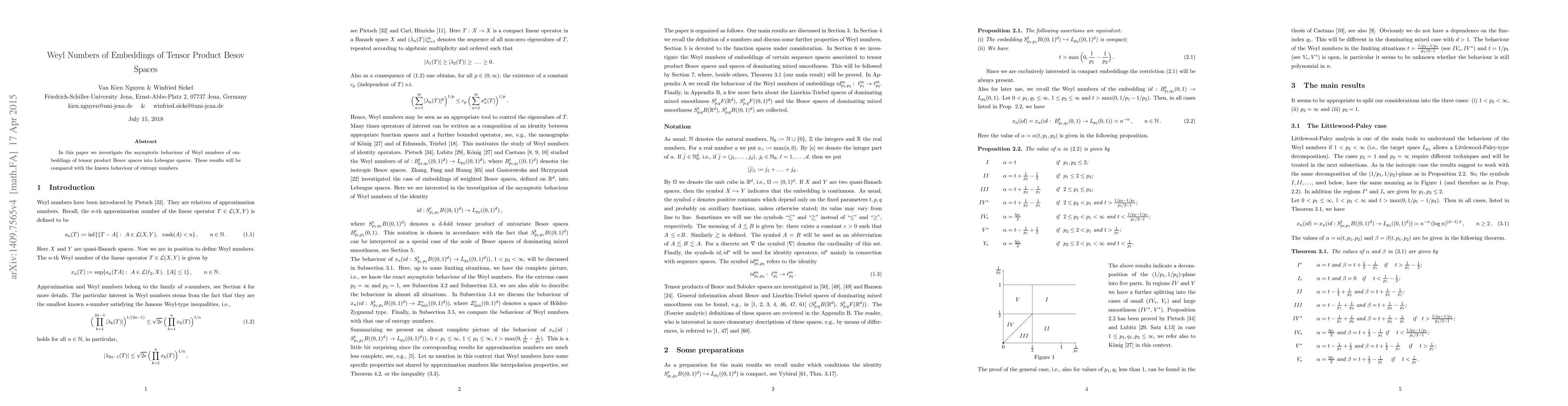 This paper investigates the behavior of Weyl numbers for embeddings of tensor product Besov spaces into Lebesgue spaces, comparing with entropy numbers findings.