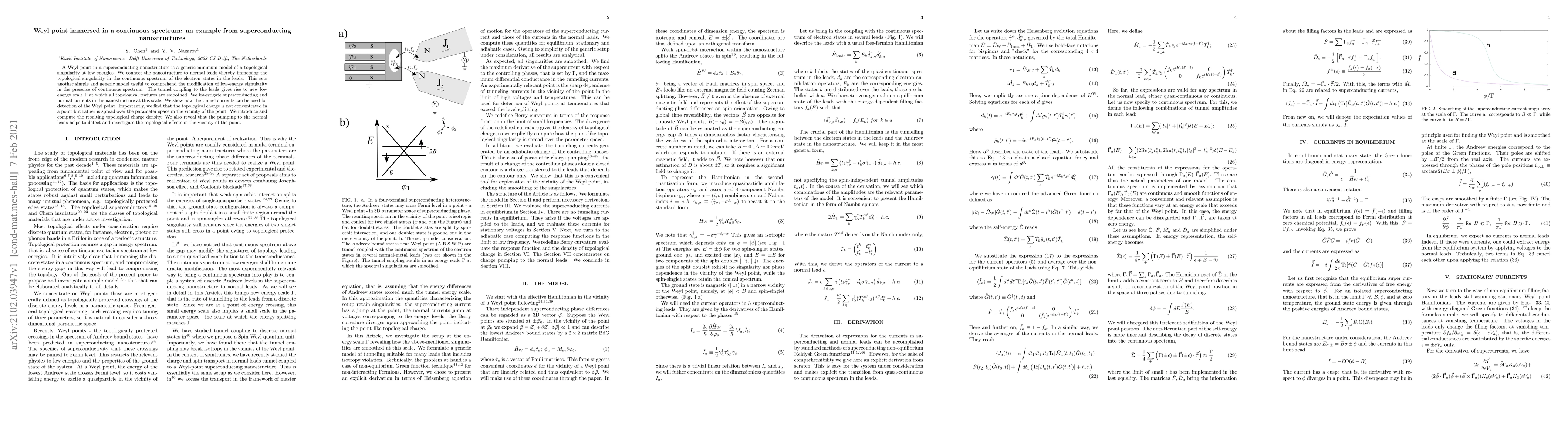 A Weyl point in a superconducting nanostructure is a generic minimum model of a topological singularity at low energies. We connect the nanostructure to normal leads thereby immersing the topological singularity in the continuous spectrum of the electron states in the leads. This sets another simple and generic model useful to comprehend the modification of low-energy singularity in the presence of continuous spectrum. The tunnel coupling to the leads gives rise to new low energy scale $\Gamma$ at which all topological features are smoothed. We investigate superconducting and normal currents in the nanostructure at this scale. We show how the tunnel currents can be used for detection of the Weyl point. Importantly, we find that the topological charge is not concentrated in a point but rather is spread over the parameter space in the vicinity of the point. We introduce and compute the resulting topological charge density. We also reveal that the pumping to the normal leads helps to detect and investigate the topological effects in the vicinity of the point.