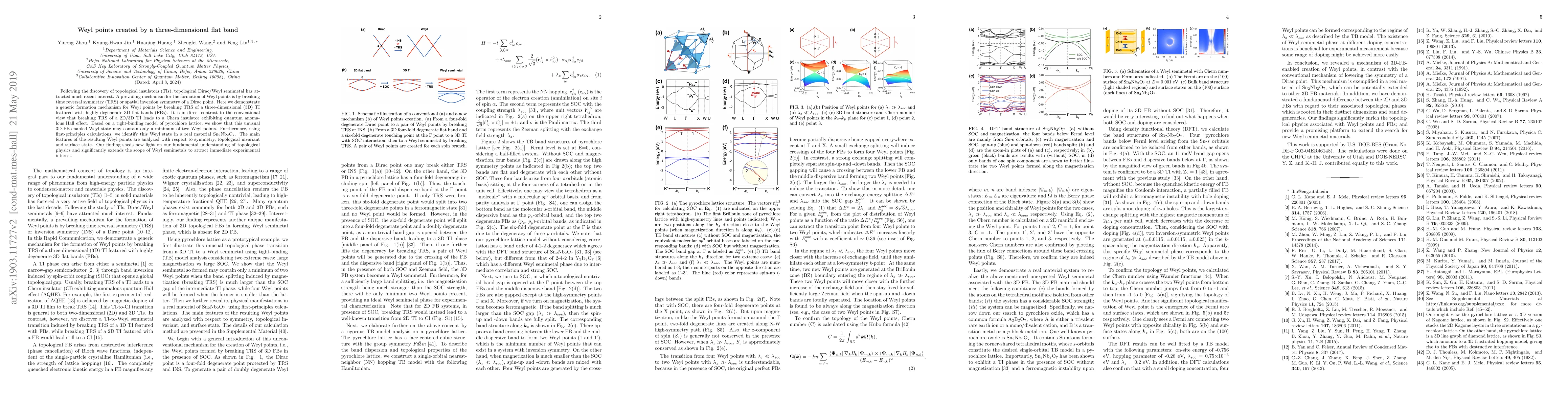 Following the discovery of topological insulators (TIs), topological Dirac/Weyl semimetal has attracted much recent interest. A prevailing mechanism for the formation of Weyl points is by breaking time-reversal symmetry (TRS) or spatial inversion symmetry of a Dirac point. Here we demonstrate a generic formation mechanism for Weyl points by breaking TRS of a three-dimensional (3D) TI featured with highly degenerate 3D flat bands (FBs). It is in direct contrast to the conventional view that breaking TRS of a 2D/3D TI leads to a Chern insulator exhibiting quantum anomalous Hall effect. Based on a tight-binding model of pyrochlore lattice, we show that this unusual 3D-FB-enabled Weyl state may contain only a minimum of two Weyl points. Furthermore, using first-principles calculations, we identify this Weyl state in a real material Sn$_2$Nb$_2$O$_7$. The main features of the resulting Weyl points are analyzed with respect to symmetry, topological invariant and surface state. Our finding sheds new light on our fundamental understanding of topological physics and significantly extends the scope of Weyl semimetals to attract immediate experimental interest.