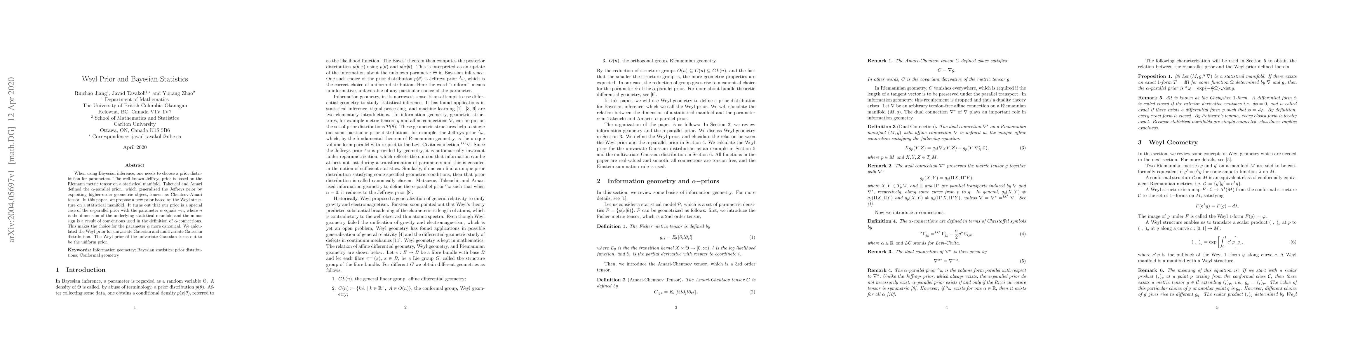 When using Bayesian inference, one needs to choose a prior distribution for parameters. The well-known Jeffreys prior is based on the Riemann metric tensor on a statistical manifold. Takeuchi and Amari defined the $\alpha$-parallel prior,, which generalized the Jeffreys prior by exploiting higher-order geometric object, known as Chentsov-Amari tensor. In this paper, we propose a new prior based on the Weyl structure on a statistical manifold. It turns out that our prior is a special case of the $\alpha$-parallel prior with the parameter $\alpha$ equals $-n$, where $n$ is the dimension of the underlying statistical manifold and the minus sign is a result of conventions used in the definition of $\alpha$-connections. This makes the choice for the parameter $\alpha$ more canonical. We calculated the Weyl prior for univariate Gaussian and multivariate Gaussian distribution. The Weyl prior of the univariate Gaussian turns out to be the uniform prior.