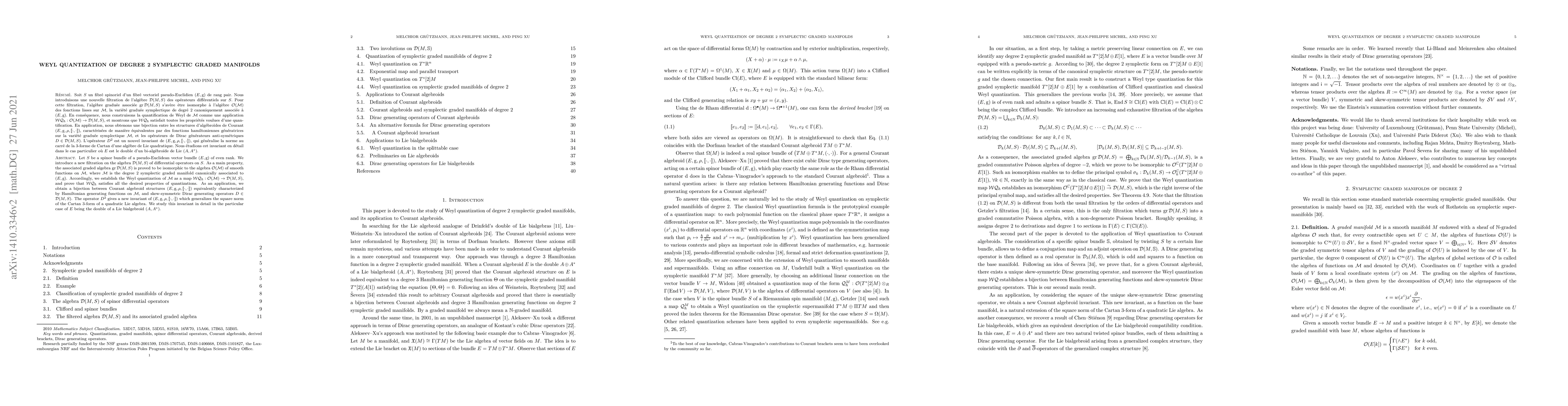Let $S$ be a spinor bundle of a pseudo-Euclidean vector bundle $(E,\mathrm{g})$ of even rank. We introduce a new filtration on the algebra $\mathcal{D}(M,S)$ of differential operators on $S$. As main property, the associated graded algebra $\mathrm{gr}\mathcal{D}(M,S)$ is isomorphic to the algebra $\mathcal{O}(\mathcal{M})$ of functions on $\mathcal{M}$, where $\mathcal{M}$ is the symplectic graded manifold of degree $2$ canonically associated to $(E,\mathrm{g})$. Accordingly, we define the Weyl quantization on $\mathcal{M}$ as a map $\mathcal{WQ}_\hbar:\mathcal{O}(\mathcal{M})\to\mathcal{D}(M,S)$, and prove that $\mathcal{WQ}_\hbar$ satisfies all desired usual properties. As an application, we obtain a bijection between Courant algebroid structures $(E,\mathrm{g},\rho,[\cdot,\cdot])$, that are encoded by Hamiltonian generating functions on $\mathcal{M}$, and skew-symmetric Dirac generating operators $D\in\mathcal{D}(M,S)$. The operator $D^2$ gives a new invariant of $(E,\mathrm{g},\rho,[\cdot,\cdot])$, which generalizes the square norm of the Cartan $3$-form of a quadratic Lie algebra. We study in detail the particular case of $E$ being the double of a Lie bialgebroid $(A,A^*)$.