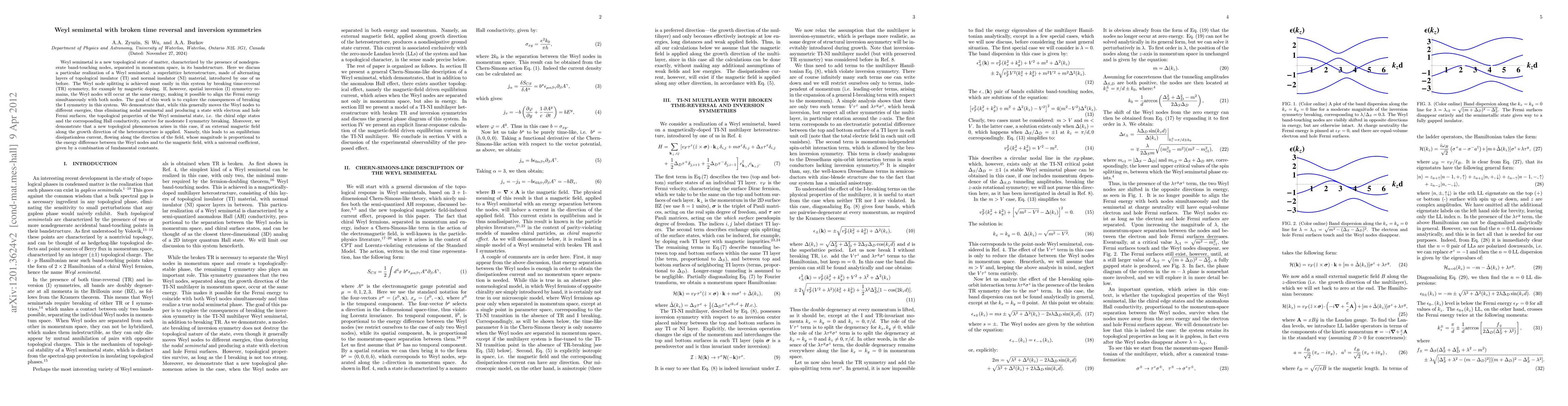 Weyl semimetal is a new topological state of matter, characterized by the presence of nondegenerate band-touching nodes, separated in momentum space, in its bandstructure. Here we discuss a particular realization of a Weyl semimetal: a superlattice heterostructure, made of alternating layers of topological insulator (TI) and normal insulator (NI) material, introduced by one of us before. The Weyl node splitting is achieved most easily in this system by breaking time-reversal (TR) symmetry, for example by magnetic doping. If, however, spatial inversion (I) symmetry remains, the Weyl nodes will occur at the same energy, making it possible to align the Fermi energy simultaneously with both nodes. The goal of this work is to explore the consequences of breaking the I symmetry in this system. We demonstrate that, while this generally moves the Weyl nodes to different energies, thus eliminating nodal semimetal and producing a state with electron and hole Fermi surfaces, the topological properties of the Weyl semimetal state, i.e. the chiral edge states and the corresponding Hall conductivity, survive for moderate I symmetry breaking. Moreover, we demonstrate that a new topological phenomenon arises in this case, if an external magnetic field along the growth direction of the heterostructure is applied. Namely, this leads to an equilibrium dissipationless current, flowing along the direction of the field, whose magnitude is proportional to the energy difference between the Weyl nodes and to the magnetic field, with a universal coefficient, given by a combination of fundamental constants.