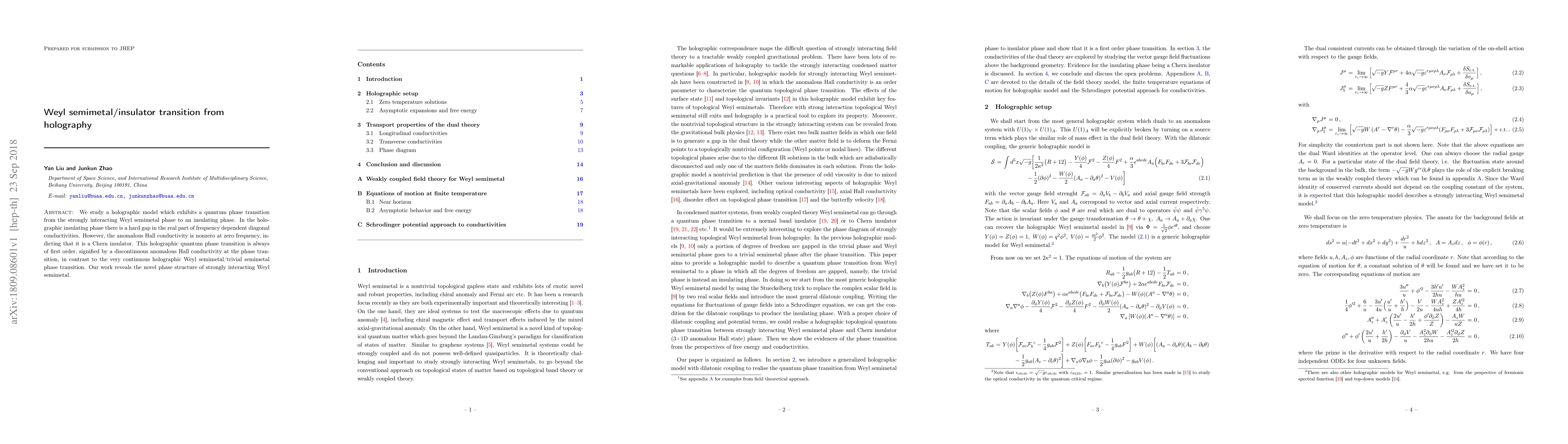 This paper investigates a holographic model demonstrating a first-order quantum phase transition from a strongly interacting Weyl semimetal to an insulating phase, characterized by a hard gap in the real part of frequency-dependent conductivities and a nonzero anomalous Hall conductivity, indicating a Chern insulator. The transition is marked by a discontinuous anomalous Hall conductivity, contrasting with the continuous transition between Weyl and trivial semimetals.