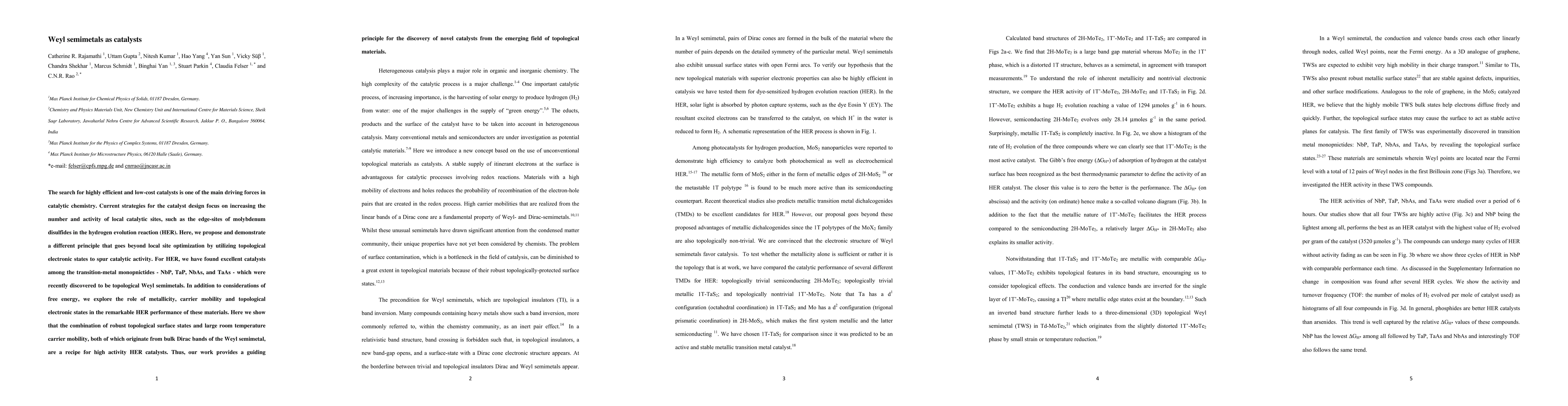 This paper proposes using topological Weyl semimetals as efficient catalysts, demonstrating that materials like NbP, TaP, NbAs, and TaAs exhibit excellent hydrogen evolution reaction performance due to their robust topological surface states and high carrier mobility. The study suggests a new principle for catalyst design based on global topological properties rather than local site optimization.