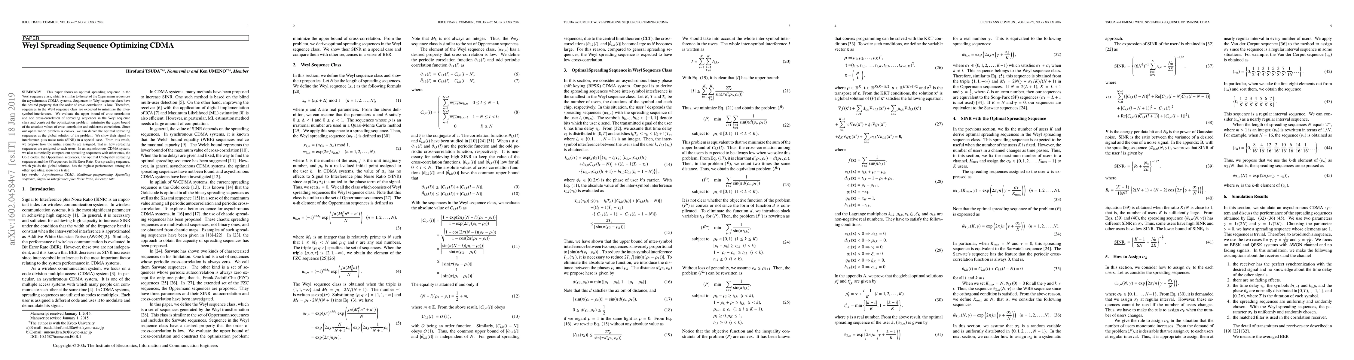This paper shows an optimal spreading sequence in the Weyl sequence class, which is similar to the set of the Oppermann sequences for asynchronous CDMA systems. Sequences in Weyl sequence class have the desired property that the order of cross-correlation is low. Therefore, sequences in the Weyl sequence class are expected to minimize the inter-symbol interference. We evaluate the upper bound of cross-correlation and odd cross-correlation of spreading sequences in the Weyl sequence class and construct the optimization problem: minimize the upper bound of the absolute values of cross-correlation and odd cross-correlation. Since our optimization problem is convex, we can derive the optimal spreading sequences as the global solution of the problem. We show their signal to interference plus noise ratio (SINR) in a special case. From this result, we propose how the initial elements are assigned, that is, how spreading sequences are assigned to each users. In an asynchronous CDMA system, we also numerically compare our spreading sequences with other ones, the Gold codes, the Oppermann sequences, the optimal Chebyshev spreading sequences and the SP sequences in Bit Error Rate. Our spreading sequence, which yields the global solution, has the highest performance among the other spreading sequences tested.