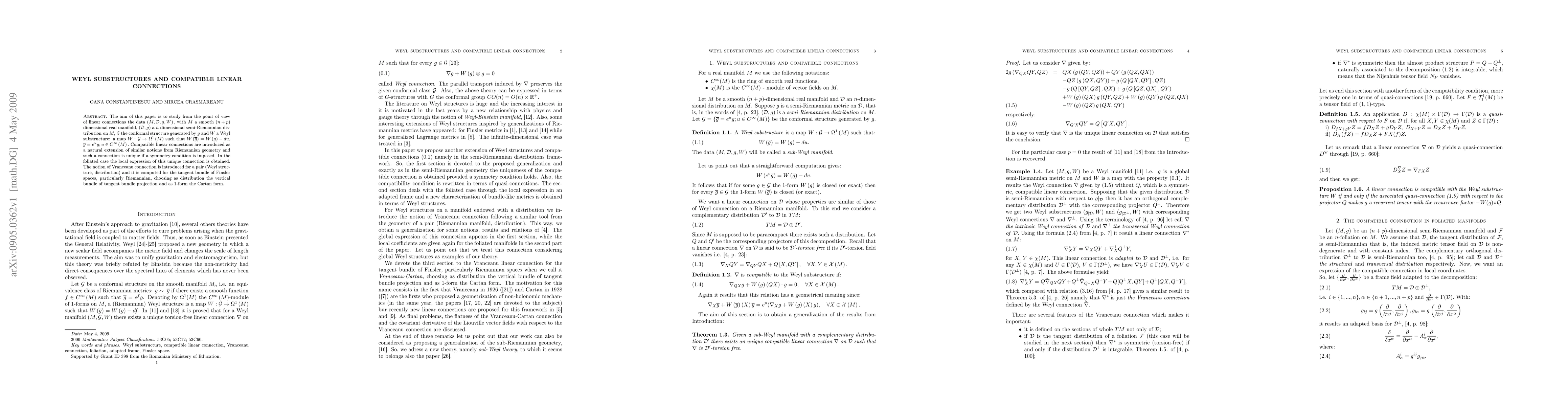 The aim of this paper is to study from the point of view of linear connections the data $(M,\mathcal{D},g,W),$ with $M$ a smooth $(n+p)$ dimensional real manifold, $(\mathcal{D},g)$ a \textit{$n$}\textit{\emph{dimensional semi-Riemannian distribution}}\emph{}on $M,$ $\mathcal{G}$ the conformal structure generated by $g$ and $W$ a Weyl substructure: a map $W:$ $\mathcal{G}\to$ $\Omega^{1}(M)$ such that $W(\overline{g})=W(g)-du,$ $\overline{g}=e^{u}g;u\in C^{\infty}(M)$. Compatible linear connections are introduced as a natural extension of similar notions from Riemannian geometry and such a connection is unique if a symmetry condition is imposed. In the foliated case the local expression of this unique connection is obtained. The notion of Vranceanu connection is introduced for a pair (Weyl structure, distribution) and it is computed for the tangent bundle of Finsler spaces, particularly Riemannian, choosing as distribution the vertical bundle of tangent bundle projection and as 1-form the Cartan form.