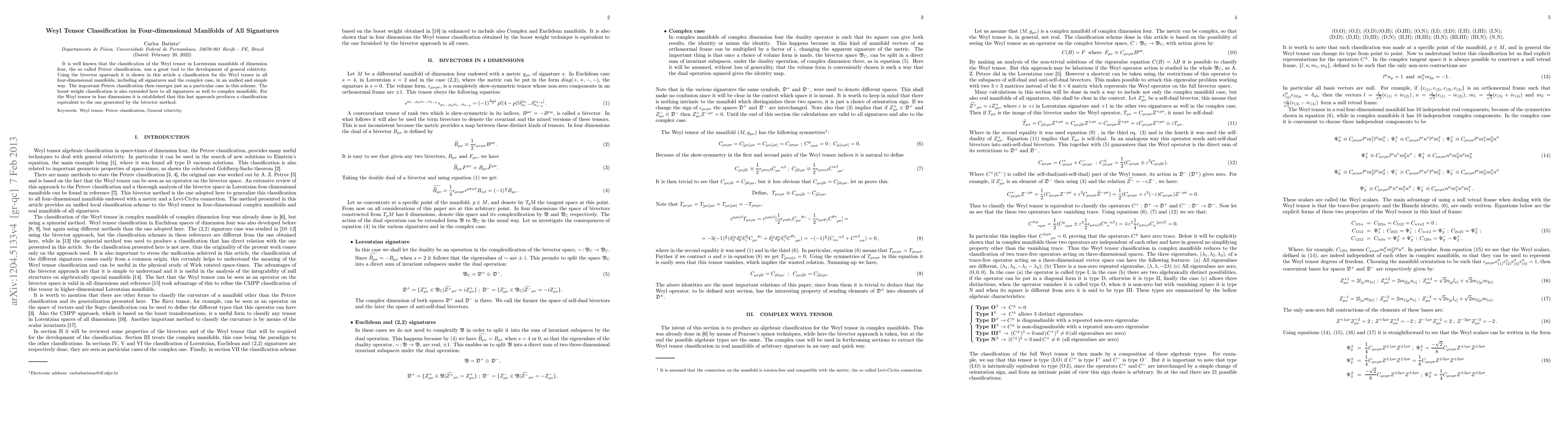 This paper presents a unified classification of the Weyl tensor in four-dimensional manifolds of all signatures, extending the Petrov classification to include complex cases. The bivector approach is used to achieve this classification, which also encompasses the boost weight classification for all signatures and complex manifolds.