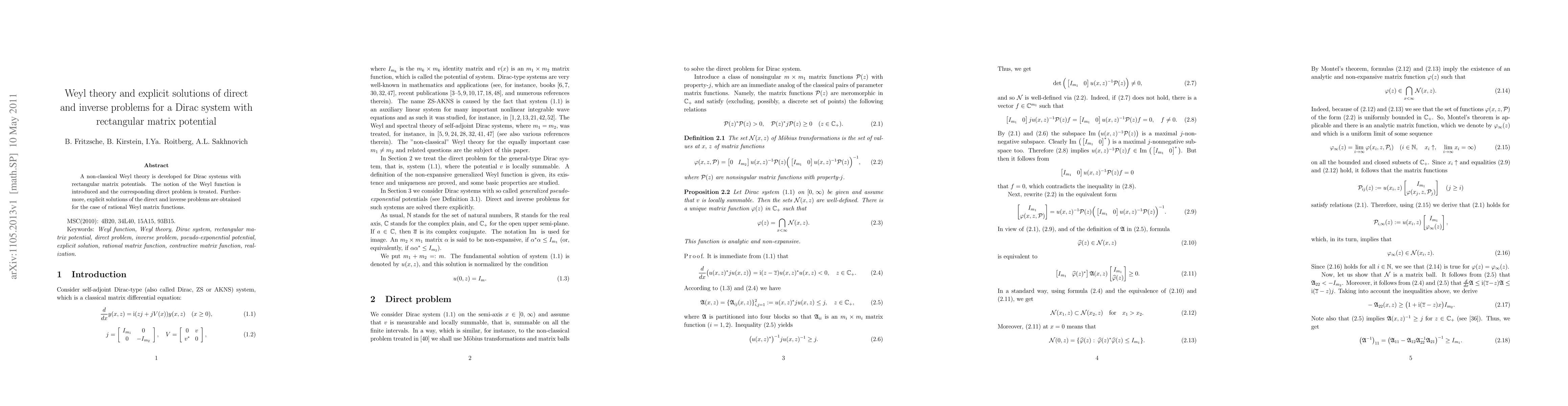 This paper develops a non-classical Weyl theory for Dirac systems with rectangular matrix potentials, introducing the Weyl function and solving both direct and inverse problems explicitly for rational Weyl matrix functions.
