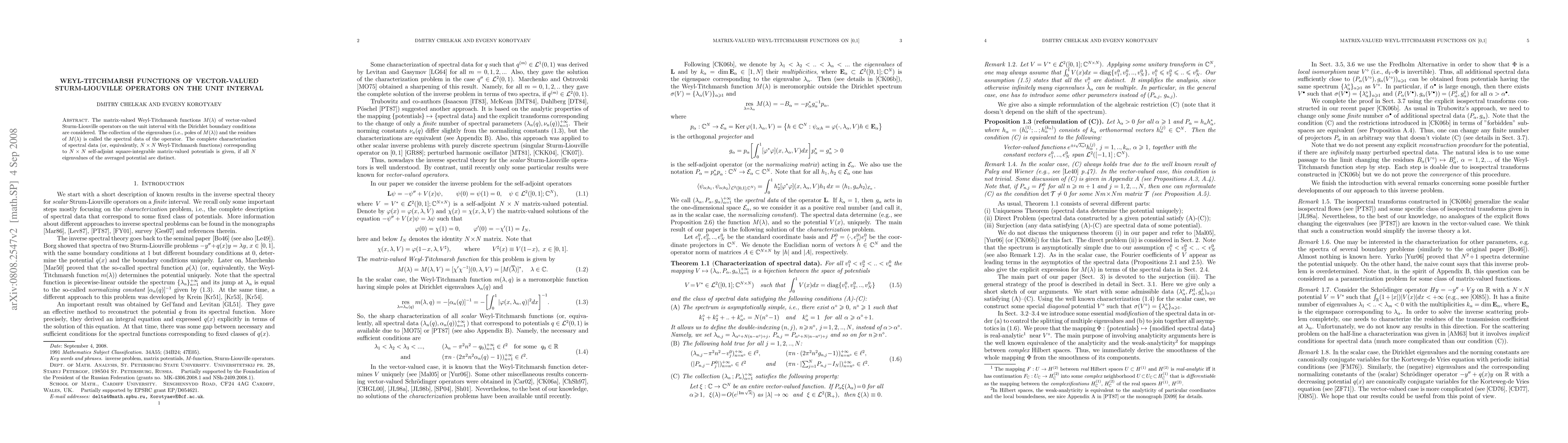 This paper characterizes the spectral data of vector-valued Sturm-Liouville operators on the unit interval, focusing on matrix-valued Weyl-Titchmarsh functions and their poles (eigenvalues) and residues. It provides a complete description of these spectral data under the condition that all eigenvalues of the averaged potential are distinct.