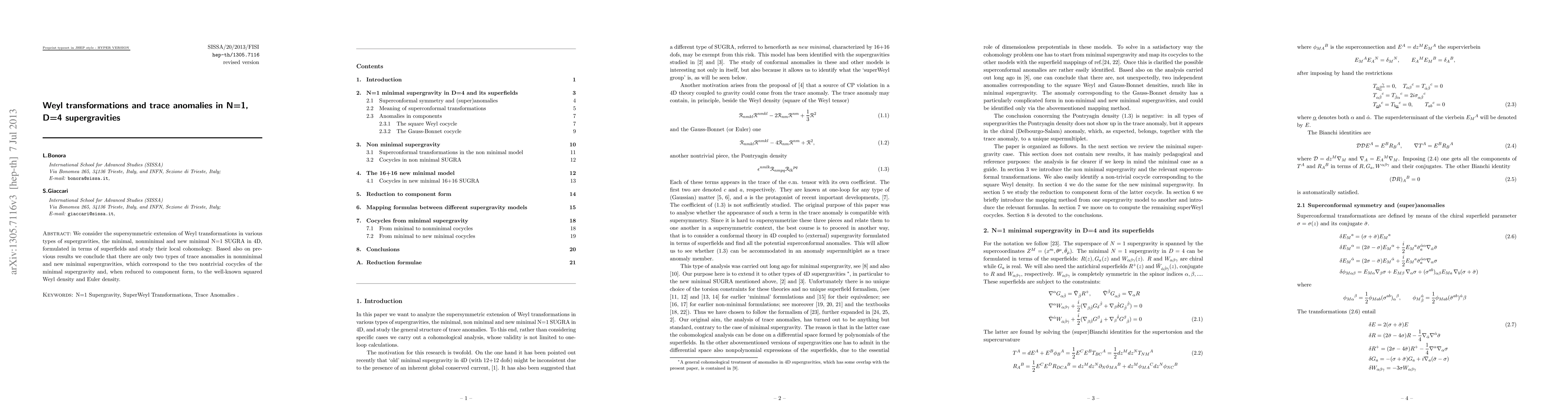 This research identifies the supersymmetric extensions of Weyl transformations in different types of N=1, D=4 supergravities and concludes that nonminimal and new minimal supergravities exhibit two types of trace anomalies corresponding to squared Weyl and Euler densities. New minimal supergravity has additional nontrivial cocycles that vanish in minimal supergravity.