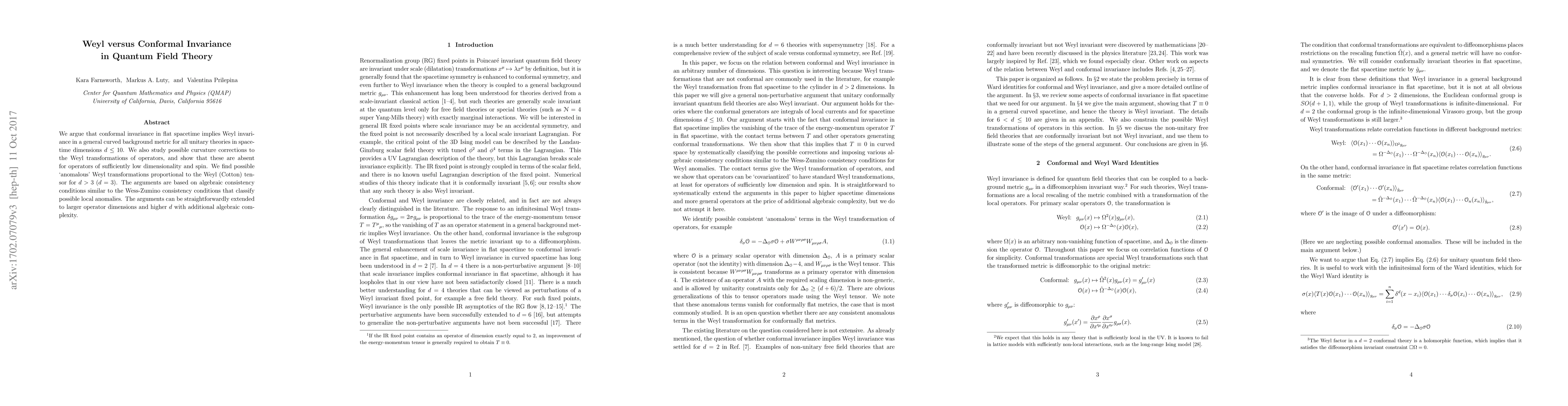 In quantum field theory, conformal invariance in flat spacetime implies Weyl invariance in curved backgrounds for dimensions $d \leq 10$, with no curvature corrections for low-dimensionality and spin operators. Anomalies arise proportional to the Weyl tensor for dimensions $d > 3$ and $d = 3$.