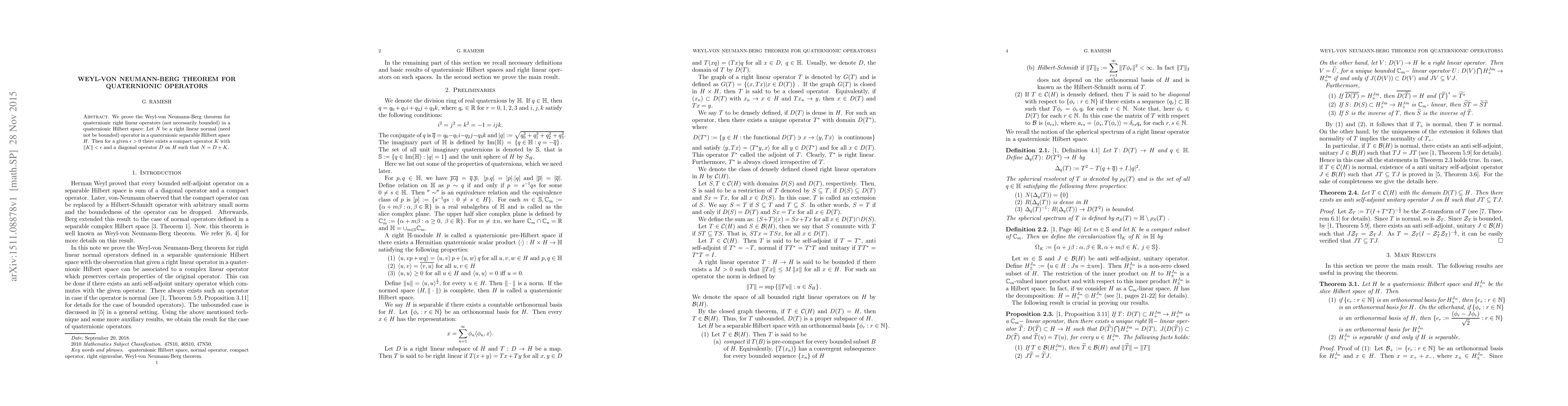 The Weyl-von Neumann-Berg theorem is extended to quaternionic right linear operators in a quaternionic Hilbert space, showing that any such normal operator can be decomposed into a diagonal operator and a compact operator with arbitrary precision.