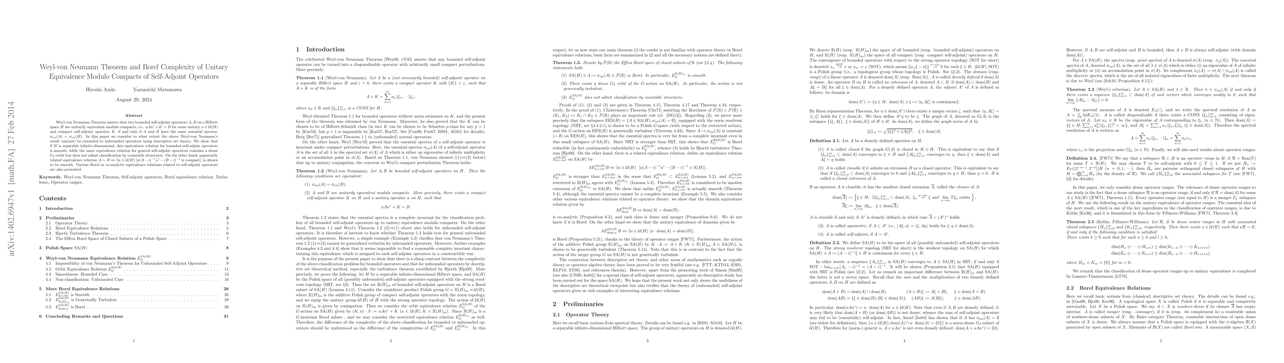 The Weyl-von Neumann Theorem establishes unitary equivalence of bounded self-adjoint operators modulo compacts if they share the same essential spectra. This paper extends the theorem's implications to unbounded operators using descriptive set theory, showing that while bounded cases are smooth, general self-adjoint operators' equivalence lacks classification by countable structures.