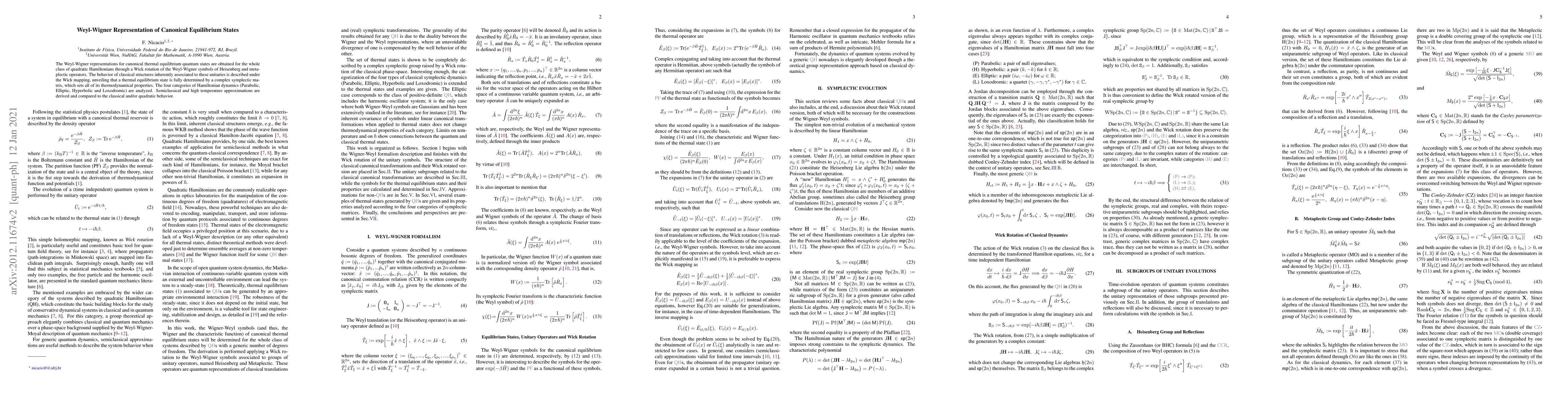 The Weyl-Wigner representations for canonical thermal equilibrium quantum states are obtained for the whole class of quadratic Hamiltonians through a Wick rotation of the Weyl-Wigner symbols of Heisenberg and metaplectic operators. The behavior of classical structures inherently associated to these unitaries is described under the Wick mapping, unveiling that a thermal equilibrium state is fully determined by a complex symplectic matrix, which sets all of its thermodynamical properties. The four categories of Hamiltonian dynamics (Parabolic, Elliptic, Hyperbolic, and Loxodromic) are analyzed. Semiclassical and high temperature approximations are derived and compared to the classical and/or quadratic behavior.