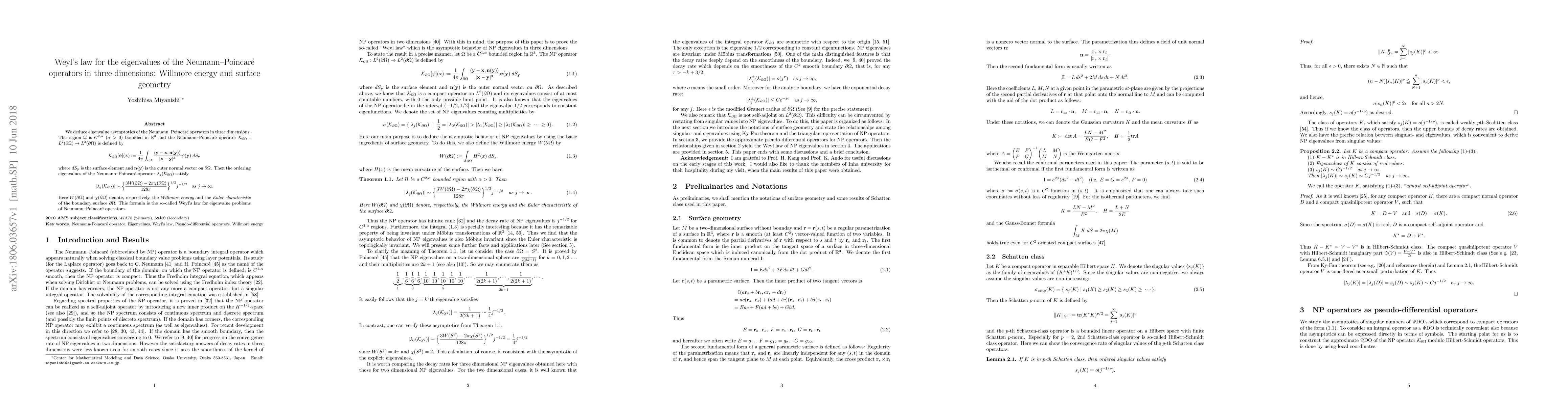 We deduce eigenvalue asymptotics of the Neumann--Poincar\'e operators in three dimensions. The region $\Omega$ is $C^{2, \alpha}$ ($\alpha>0$) bounded in ${\mathbf R}^3$ and the Neumann--Poincar\'e operator ${\mathcal K}_{\partial\Omega} : L^2(\partial \Omega) \rightarrow L^2(\partial \Omega) $ is defined by $$ {\mathcal K}_{\partial\Omega}[\psi]({\bf x}) := \frac{1}{4\pi} \int_{\partial \Omega} \frac{\langle {\bf y}-{\bf x}, {\bf n}({\bf y}) \rangle}{|{\bf x}-{\bf y}|^3} \psi({\bf y})\; dS_{\bf y} $$ where $dS_{\bf y}$ is the surface element and ${\bf n}({\bf y})$ is the outer normal vector on $\partial \Omega$. Then the ordering eigenvalues of the Neumann--Poincar\'e operator $\lambda_j ({\mathcal K}_{\partial \Omega})$ satisfy $$ |\lambda_j({\mathcal K}_{\partial \Omega})| \sim \Big\{\frac{3W(\partial \Omega) - 2\pi \chi(\partial \Omega)}{128 \pi} \Big\}^{1/2} j^{-1/2}\quad \text{as}\ j \rightarrow \infty. $$ Here $W(\partial \Omega)$ and $\chi(\partial \Omega)$ denote, respectively, the Willmore energy and the Euler charateristic of the boundary surface $\partial\Omega$. This formula is the so-called Weyl's law for eigenvalue problems of Neumann--Poincar\'e operators.
