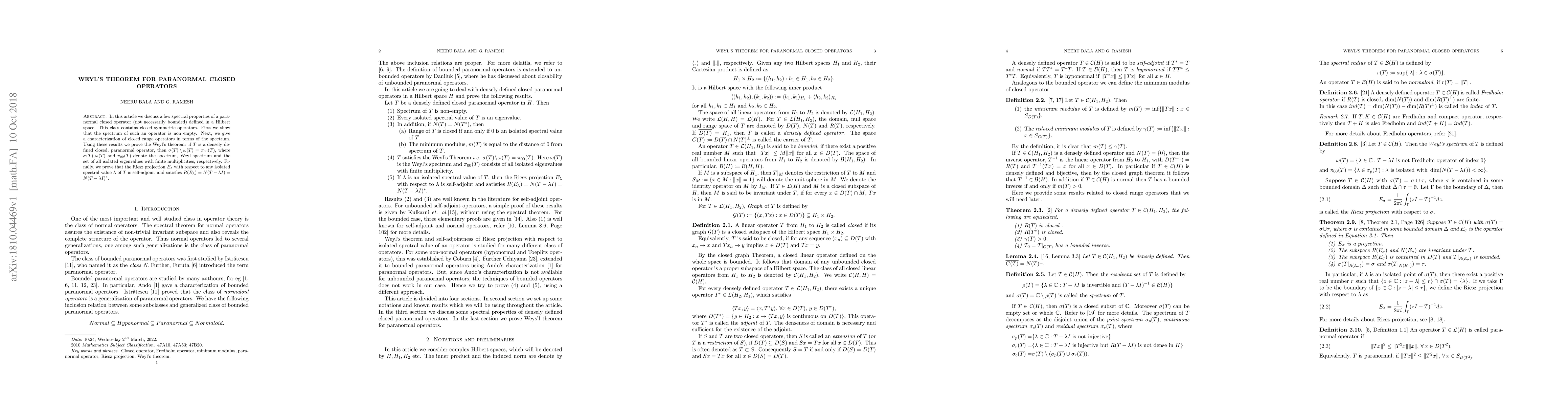 A research paper proves Weyl's theorem for paranormal closed operators in Hilbert spaces, showing that isolated eigenvalues with finite multiplicities are unique, and providing a characterization of the Riesz projection.