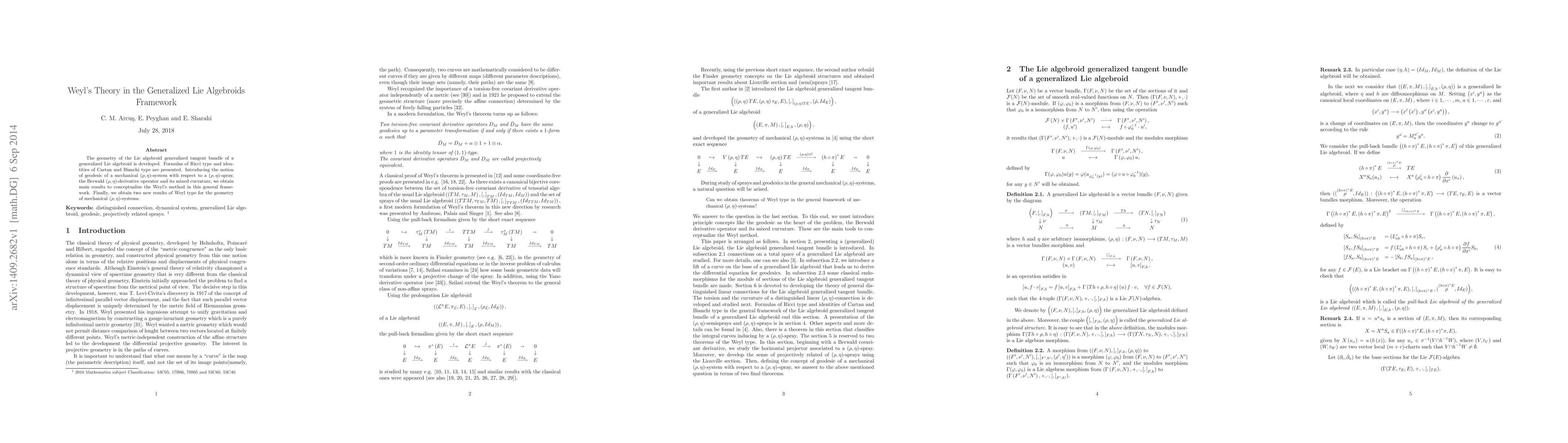 This paper develops the geometry of generalized Lie algebroids and presents Ricci-type formulas and Cartan-Bianchi identities. It introduces geodesics and Berwald derivatives in mechanical systems, leading to the conceptualization of Weyl's method in this framework and deriving two new Weyl-type results for mechanical $\left( \rho ,\eta \right) $-systems.