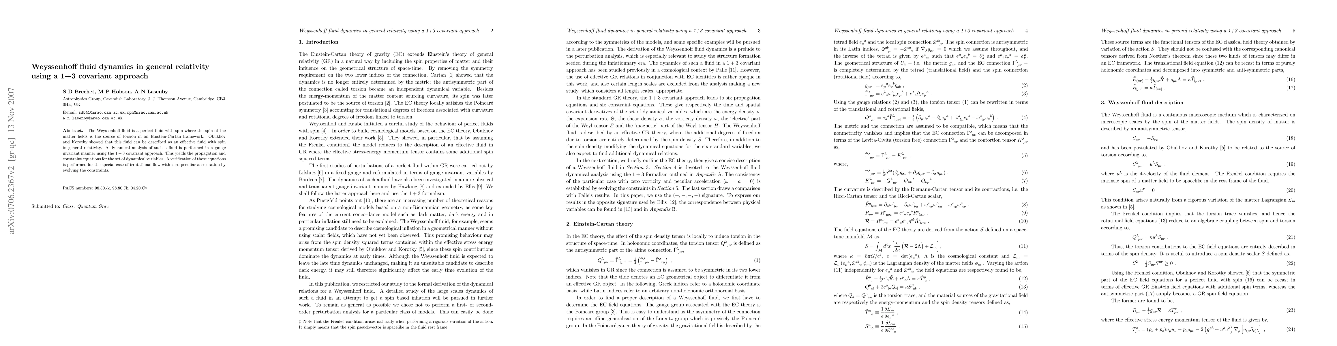 The Weyssenhoff fluid is a perfect fluid with spin where the spin of the matter fields is the source of torsion in an Einstein-Cartan framework. Obukhov and Korotky showed that this fluid can be described as an effective fluid with spin in general relativity. A dynamical analysis of such a fluid is performed in a gauge invariant manner using the 1+3 covariant approach. This yields the propagation and constraint equations for the set of dynamical variables. A verification of these equations is performed for the special case of irrotational flow with zero peculiar acceleration by evolving the constraints.