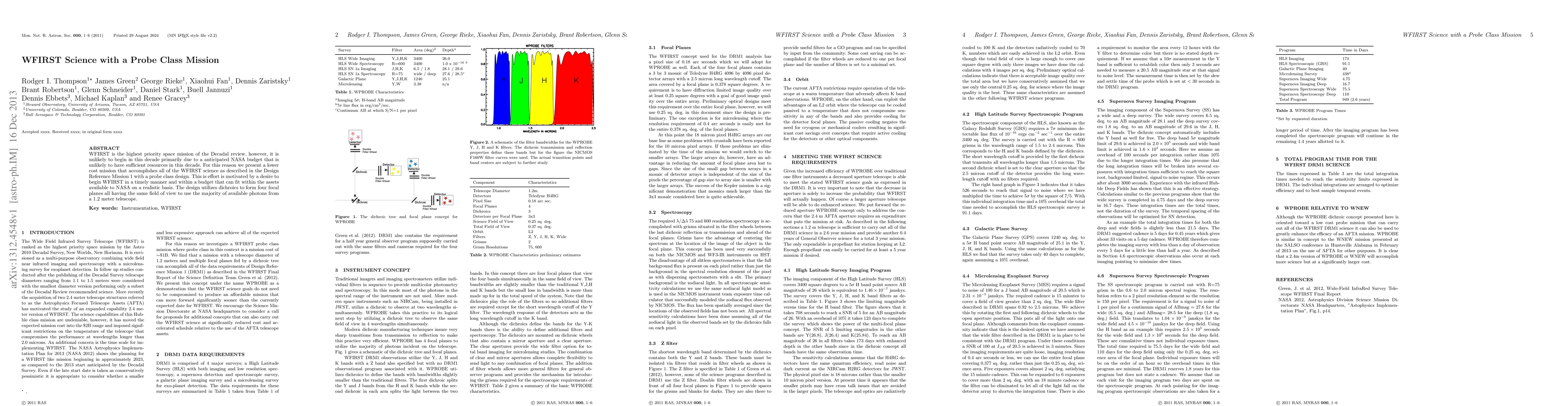 This paper proposes a lower-cost "probe class" mission to achieve the scientific goals of the WFIRST space mission using a 1.2 meter telescope and innovative dichroic design to maximize photon use. The aim is to initiate WFIRST within NASA's realistic budget constraints.