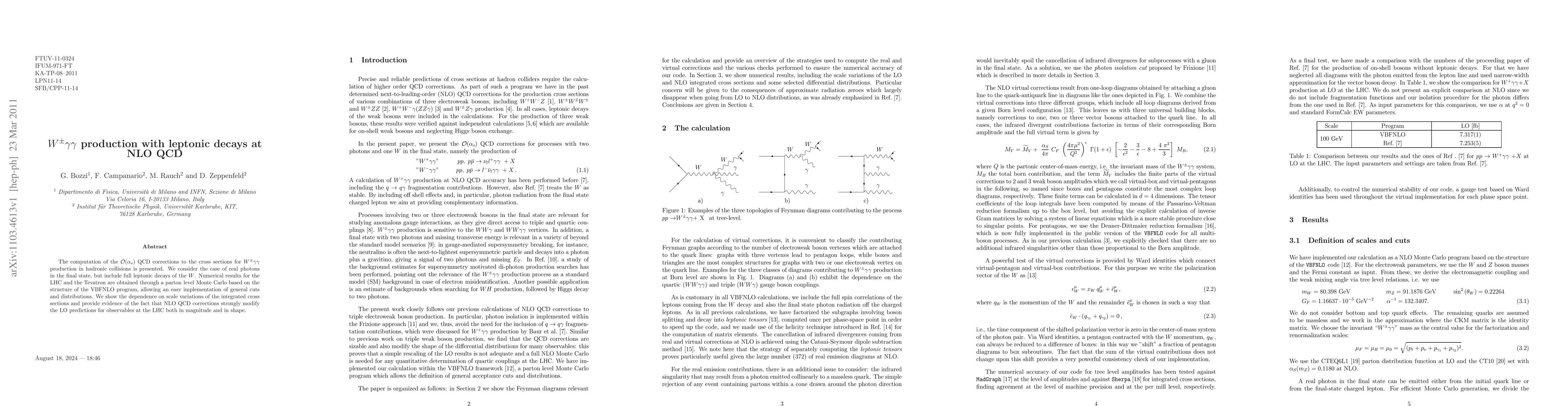 This paper presents NLO-QCD corrections for W\gamma\gamma production in hadronic collisions, focusing on real photons and full leptonic decays of the W. Numerical results from a parton level Monte Carlo show significant NLO QCD modifications to LO predictions for observables at the LHC.