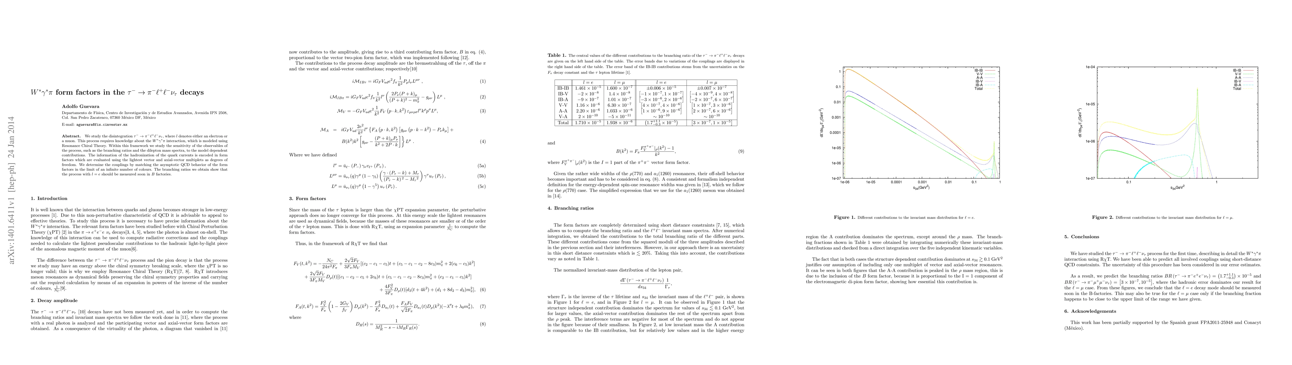 This research paper studies the decay of a tau particle into a pion, electron, muon, and neutrino using Resonance Chiral Theory to model the W*gamma*pi interaction. It finds that the process with an electron should be measured soon in B factories.