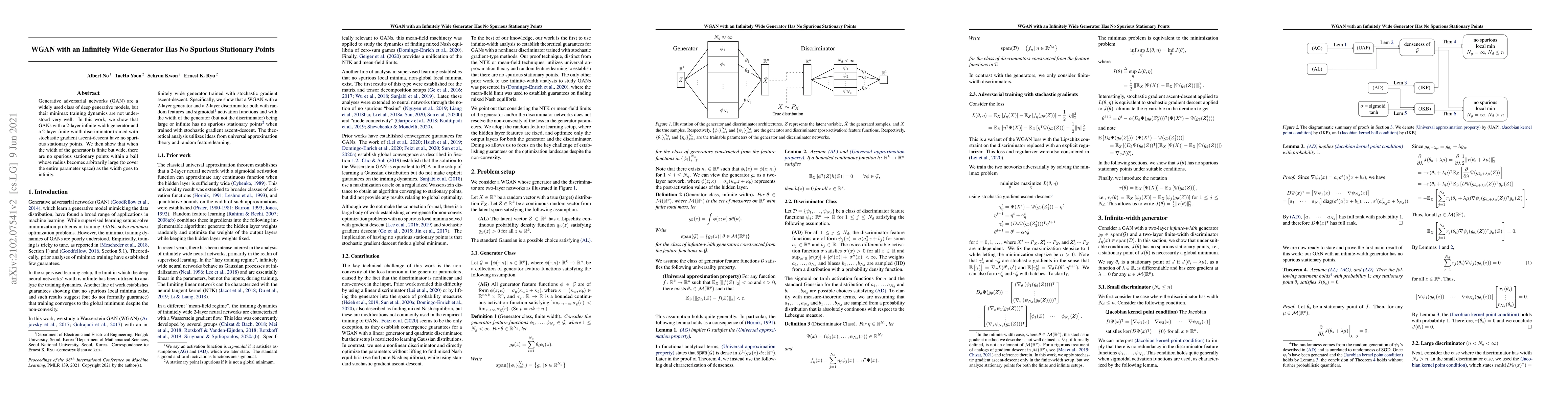 Researchers found that infinite-width GANs have no spurious stationary points, a problem in training generative models. They also showed that finite but wide generator widths avoid these issues as the width approaches infinity.