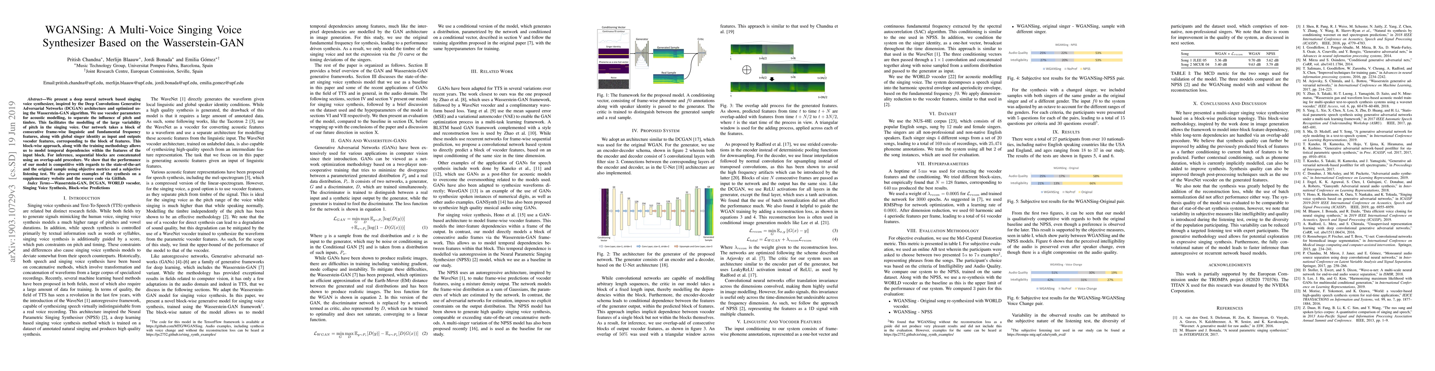 WGANSing is a singing voice synthesizer based on Wasserstein-GAN, using vocoder parameters to model pitch and timbre. It employs a block-wise approach to capture temporal dependencies, achieving competitive performance with state-of-the-art models.