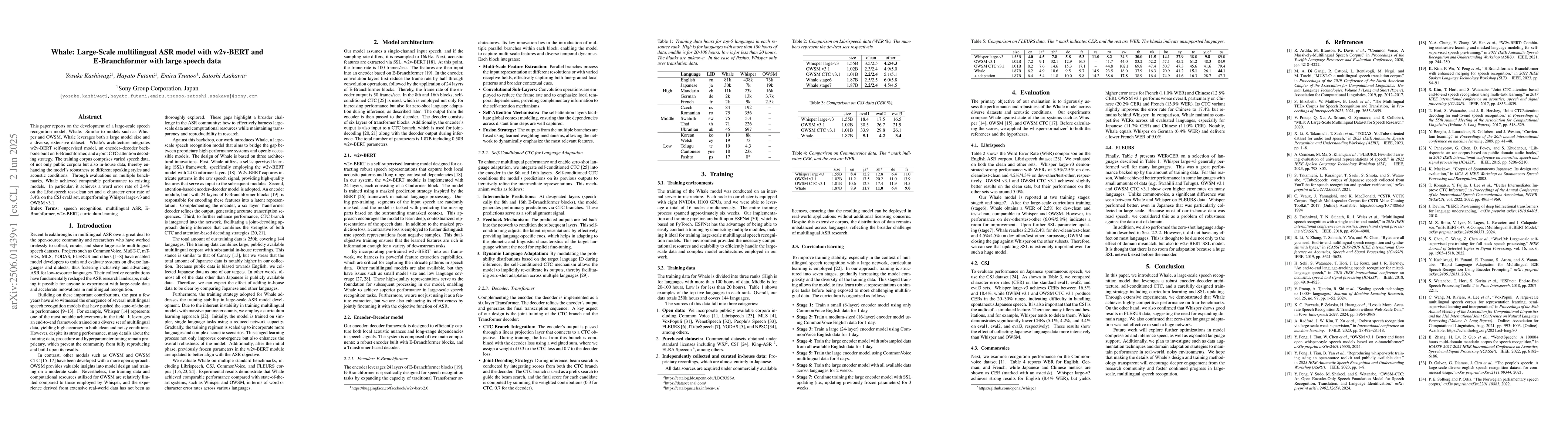 Whale is a large-scale speech recognition model that achieves comparable performance to existing models, outperforming Whisper and OWSM on certain benchmarks with a word error rate of 2.4% and character error rate of 3.4%.