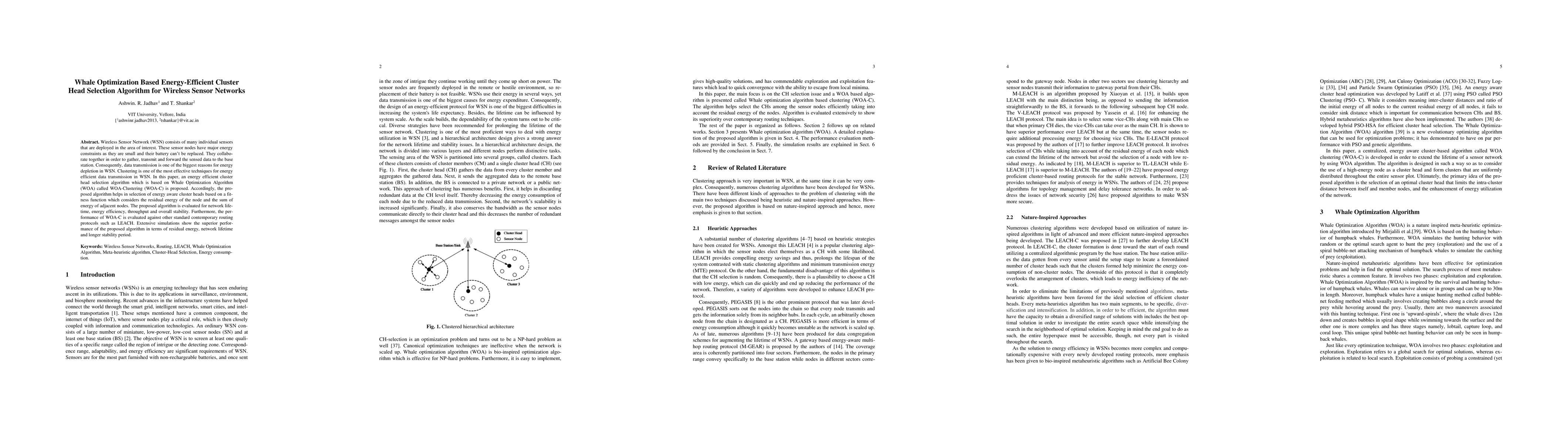 This paper proposes an energy-efficient cluster head selection algorithm, WOA-Clustering (WOA-C), based on the Whale Optimization Algorithm for Wireless Sensor Networks. The algorithm selects cluster heads considering residual energy and adjacent nodes' energy, improving network lifetime and stability compared to LEACH.