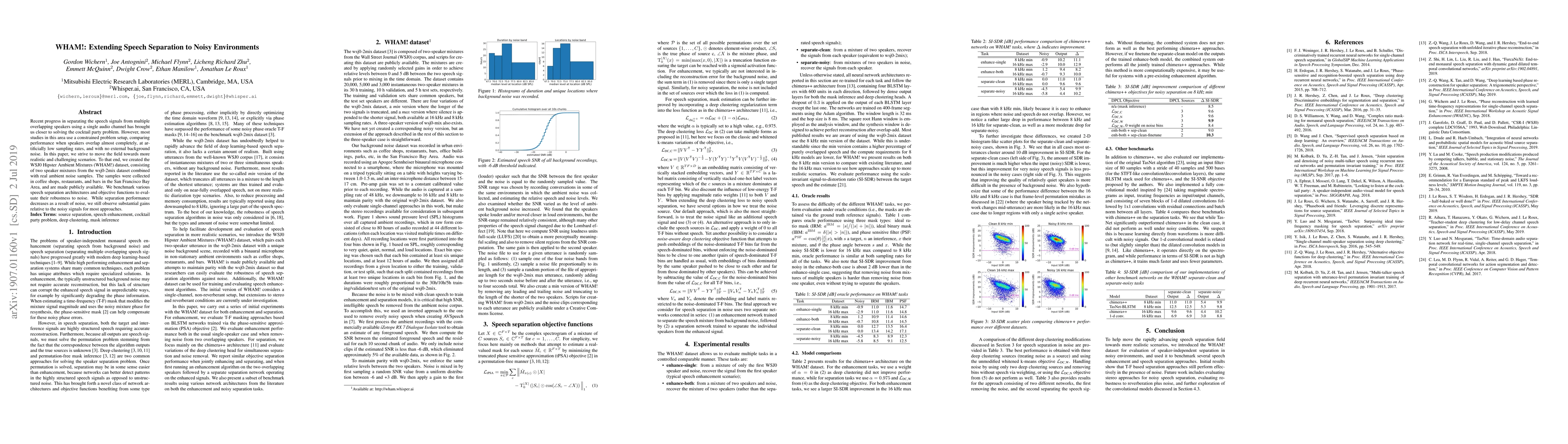 Recent progress in separating the speech signals from multiple overlapping speakers using a single audio channel has brought us closer to solving the cocktail party problem. However, most studies in this area use a constrained problem setup, comparing performance when speakers overlap almost completely, at artificially low sampling rates, and with no external background noise. In this paper, we strive to move the field towards more realistic and challenging scenarios. To that end, we created the WSJ0 Hipster Ambient Mixtures (WHAM!) dataset, consisting of two speaker mixtures from the wsj0-2mix dataset combined with real ambient noise samples. The samples were collected in coffee shops, restaurants, and bars in the San Francisco Bay Area, and are made publicly available. We benchmark various speech separation architectures and objective functions to evaluate their robustness to noise. While separation performance decreases as a result of noise, we still observe substantial gains relative to the noisy signals for most approaches.