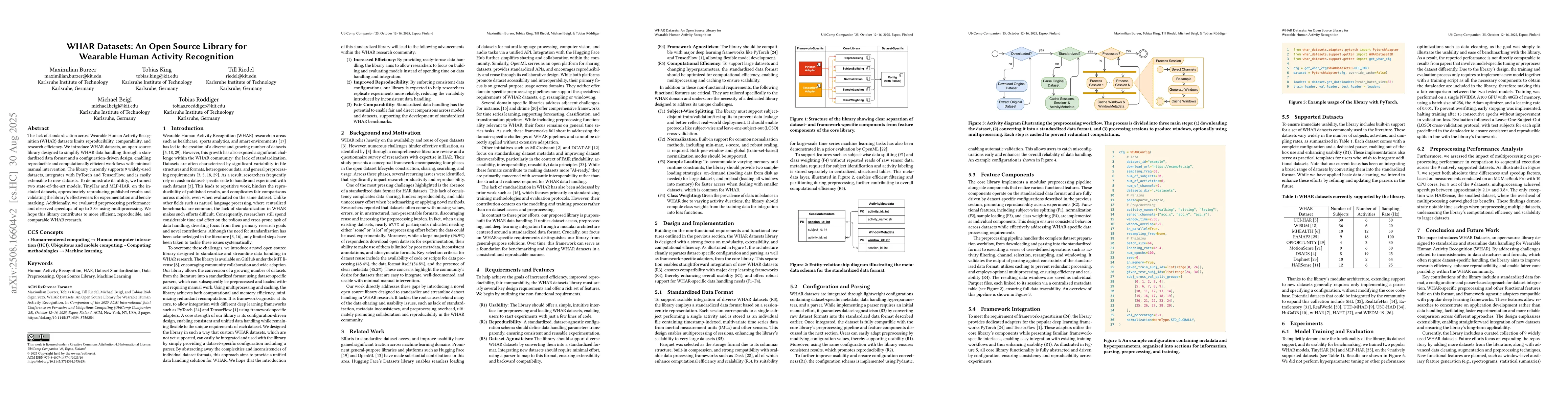 The lack of standardization across Wearable Human Activity Recognition (WHAR) datasets limits reproducibility, comparability, and research efficiency. We introduce WHAR datasets, an open-source library designed to simplify WHAR data handling through a standardized data format and a configuration-driven design, enabling reproducible and computationally efficient workflows with minimal manual intervention. The library currently supports 9 widely-used datasets, integrates with PyTorch and TensorFlow, and is easily extensible to new datasets. To demonstrate its utility, we trained two state-of-the-art models, TinyHar and MLP-HAR, on the included datasets, approximately reproducing published results and validating the library's effectiveness for experimentation and benchmarking. Additionally, we evaluated preprocessing performance and observed speedups of up to 3.8x using multiprocessing. We hope this library contributes to more efficient, reproducible, and comparable WHAR research.