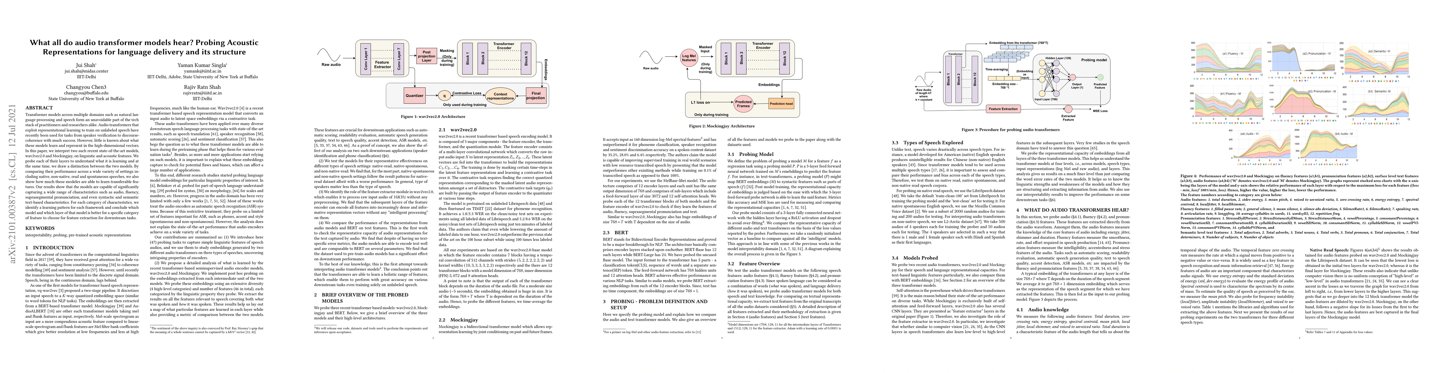 In recent times, BERT based transformer models have become an inseparable part of the 'tech stack' of text processing models. Similar progress is being observed in the speech domain with a multitude of models observing state-of-the-art results by using audio transformer models to encode speech. This begs the question of what are these audio transformer models learning. Moreover, although the standard methodology is to choose the last layer embedding for any downstream task, but is it the optimal choice? We try to answer these questions for the two recent audio transformer models, Mockingjay and wave2vec2.0. We compare them on a comprehensive set of language delivery and structure features including audio, fluency and pronunciation features. Additionally, we probe the audio models' understanding of textual surface, syntax, and semantic features and compare them to BERT. We do this over exhaustive settings for native, non-native, synthetic, read and spontaneous speech datasets