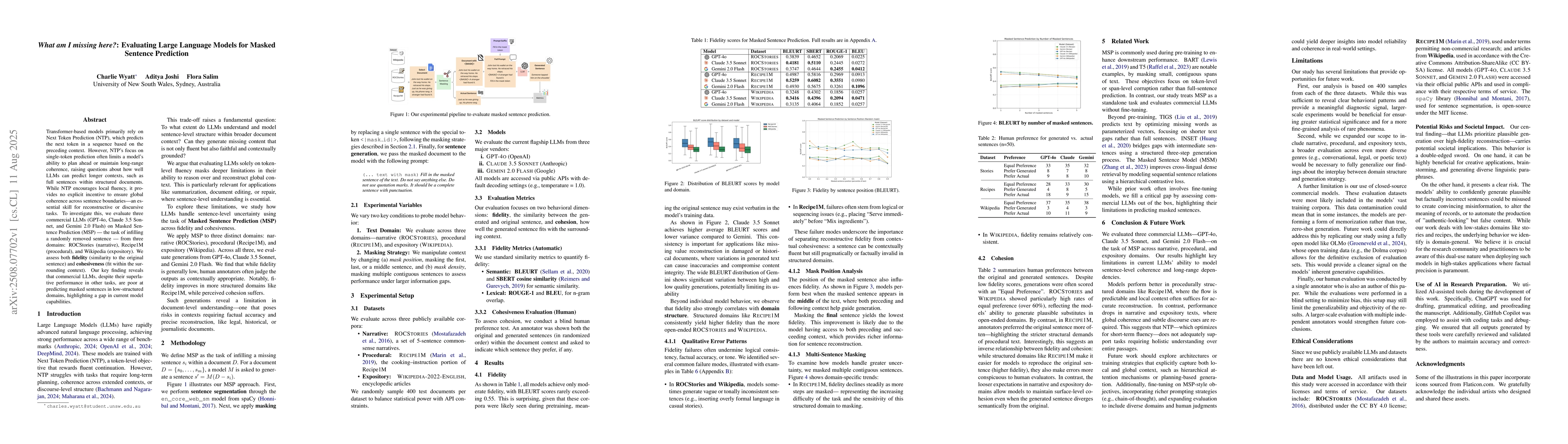 The paper evaluates three commercial LLMs (GPT-4o, Claude 3.5 Sonnet, and Gemini 2.0 Flash) on Masked Sentence Prediction (MSP) across narrative, procedural, and expository domains, assessing both fidelity and cohesiveness without fine-tuning.