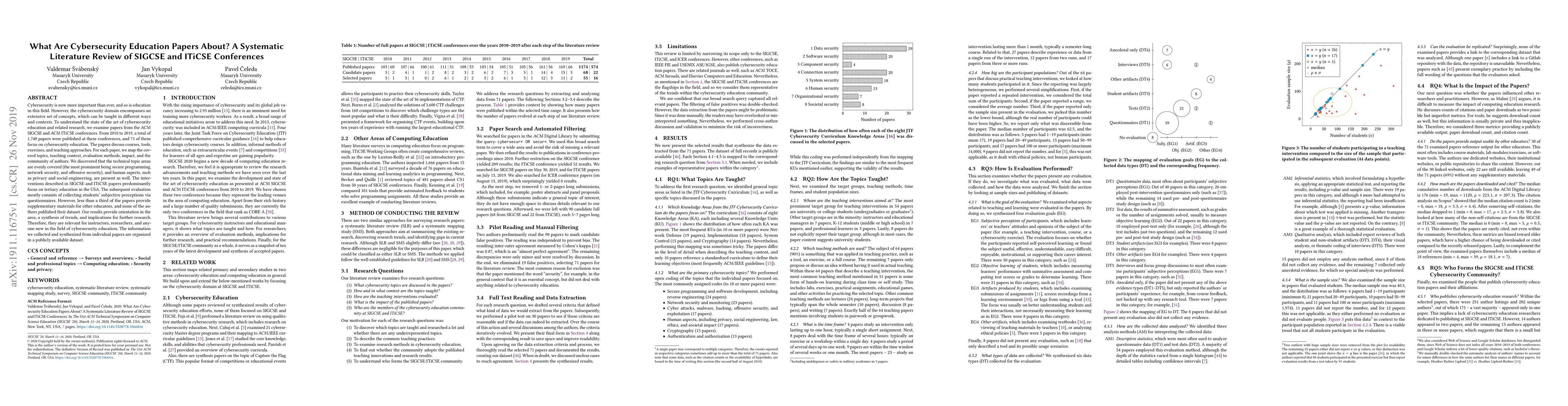A systematic literature review of 71 cybersecurity education papers from SIGCSE and ITiCSE conferences reveals a focus on teaching courses, tools, and approaches for tertiary education in the USA, with uneven coverage of technical and human aspects.