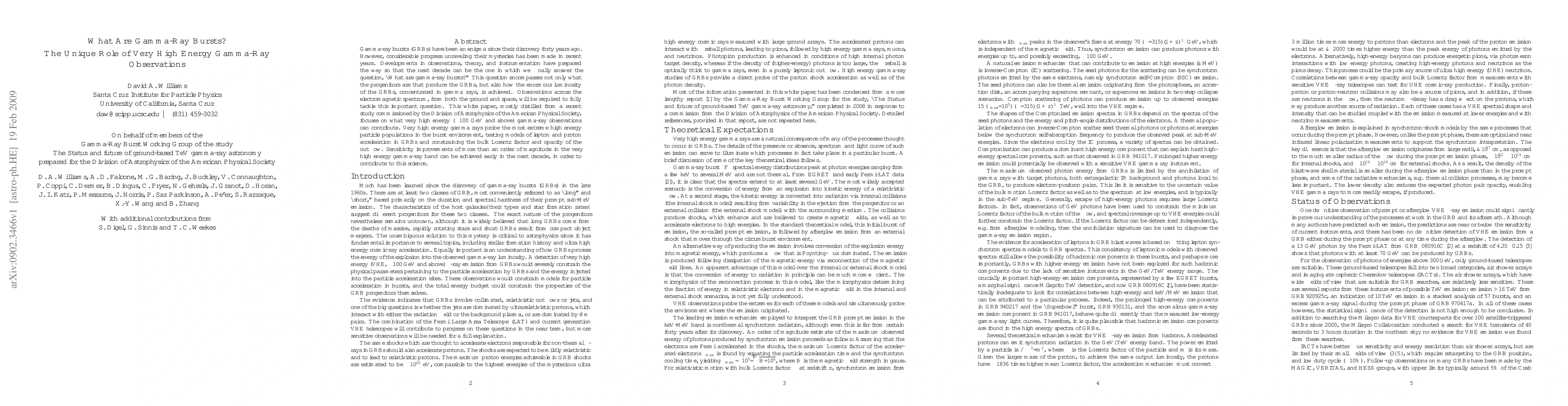 Gamma-ray bursts (GRBs) have been an enigma since their discovery forty years ago. However, considerable progress unraveling their mysteries has been made in recent years. Developments in observations, theory, and instrumentation have prepared the way so that the next decade can be the one in which we finally answer the question, "What are gamma-ray bursts?" This question encompasses not only what the progenitors are that produce the GRBs, but also how the enormous luminosity of the GRBs, concentrated in gamma rays, is achieved. Observations across the electromagnetic spectrum, from both the ground and space, will be required to fully tackle this important question. This white paper, mostly distilled from a recent study commissioned by the Division of Astrophysics of the American Physical Society, focuses on what very high energy (~100 GeV and above) gamma-ray observations can contribute. Very high energy gamma rays probe the most extreme high energy particle populations in the burst environment, testing models of lepton and proton acceleration in GRBs and constraining the bulk Lorentz factor and opacity of the outflow. Sensitivity improvements of more than an order of magnitude in the very high energy gamma-ray band can be achieved early in the next decade, in order to contribute to this science.