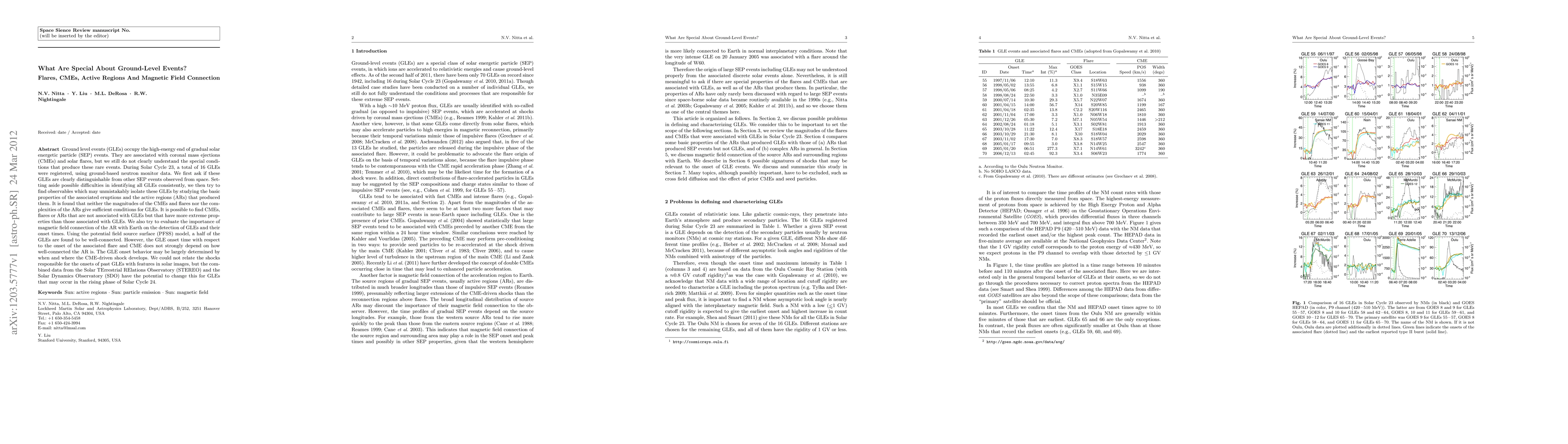 Ground level events (GLEs) occupy the high-energy end of gradual solar energetic particle (SEP) events. They are associated with coronal mass ejections (CMEs) and solar flares, but we still do not clearly understand the special conditions that produce these rare events. During Solar Cycle 23, a total of 16 GLEs were registered, using ground-based neutron monitor data. We first ask if these GLEs are clearly distinguishable from other SEP events observed from space. Setting aside possible difficulties in identifying all GLEs consistently, we then try to find observables which may unmistakably isolate these GLEs by studying the basic properties of the associated eruptions and the active regions (ARs) that produced them. It is found that neither the magnitudes of the CMEs and flares nor the complexities of the ARs give sufficient conditions for GLEs. It is possible to find CMEs, flares or ARs that are not associated with GLEs but that have more extreme properties than those associated with GLEs. We also try to evaluate the importance of magnetic field connection of the AR with Earth on the detection of GLEs and their onset times. Using the potential field source surface (PFSS) model, a half of the GLEs are found to be well-connected. However, the GLE onset time with respect to the onset of the associated flare and CME does not strongly depend on how well-connected the AR is. The GLE onset behavior may be largely determined by when and where the CME-driven shock develops. We could not relate the shocks responsible for the onsets of past GLEs with features in solar images, but the combined data from the Solar TErrestrial RElations Observatory (STEREO) and the Solar Dynamics Observatory (SDO) have the potential to change this for GLEs that may occur in the rising phase of Solar Cycle 24.