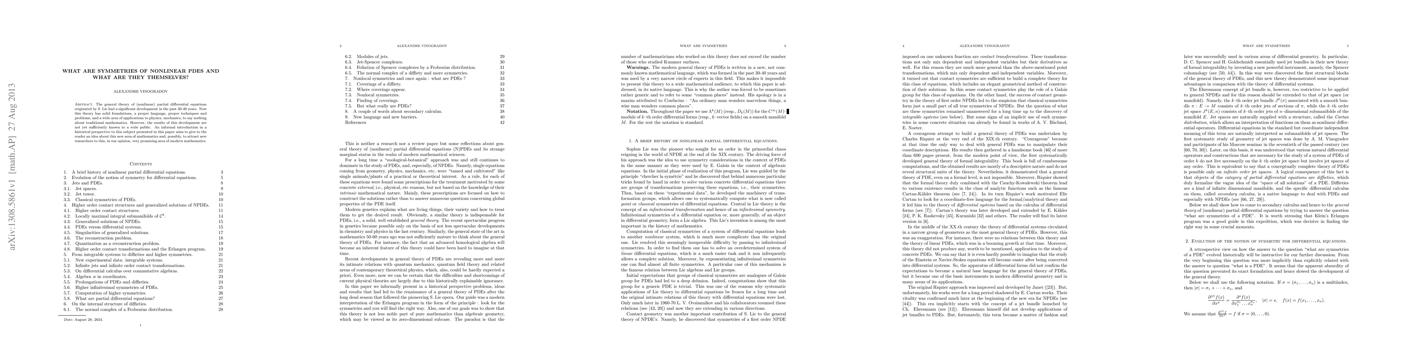 The general theory of (nonlinear) partial differential equations originated by S. Lie had a significant development in the past 30-40 years. Now this theory has solid foundations, a proper language, proper techniques and problems, and a wide area of applications to physics, mechanics, to say nothing about traditional mathematics. However, the results of this development are not yet sufficiently known to a wide public. An informal introduction in a historical perspective to this subject presented in this paper aims to give to the reader an idea about this new area of mathematics and, possibly, to attract new researchers to this, in our opinion, very promising area of modern mathematics.