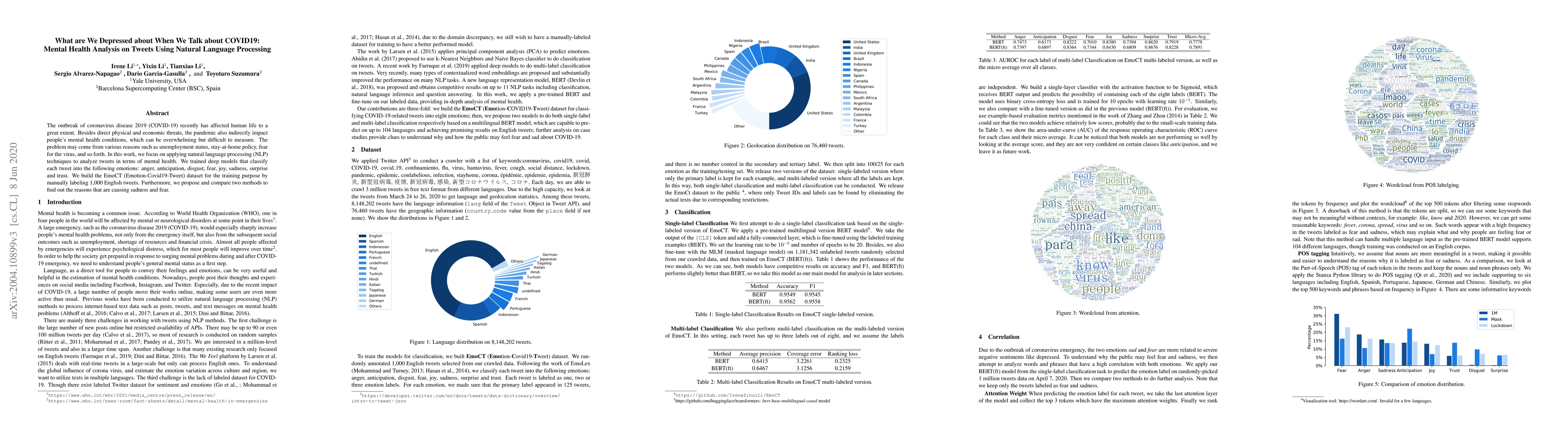 The outbreak of coronavirus disease 2019 (COVID-19) recently has affected human life to a great extent. Besides direct physical and economic threats, the pandemic also indirectly impact people's mental health conditions, which can be overwhelming but difficult to measure. The problem may come from various reasons such as unemployment status, stay-at-home policy, fear for the virus, and so forth. In this work, we focus on applying natural language processing (NLP) techniques to analyze tweets in terms of mental health. We trained deep models that classify each tweet into the following emotions: anger, anticipation, disgust, fear, joy, sadness, surprise and trust. We build the EmoCT (Emotion-Covid19-Tweet) dataset for the training purpose by manually labeling 1,000 English tweets. Furthermore, we propose and compare two methods to find out the reasons that are causing sadness and fear.
