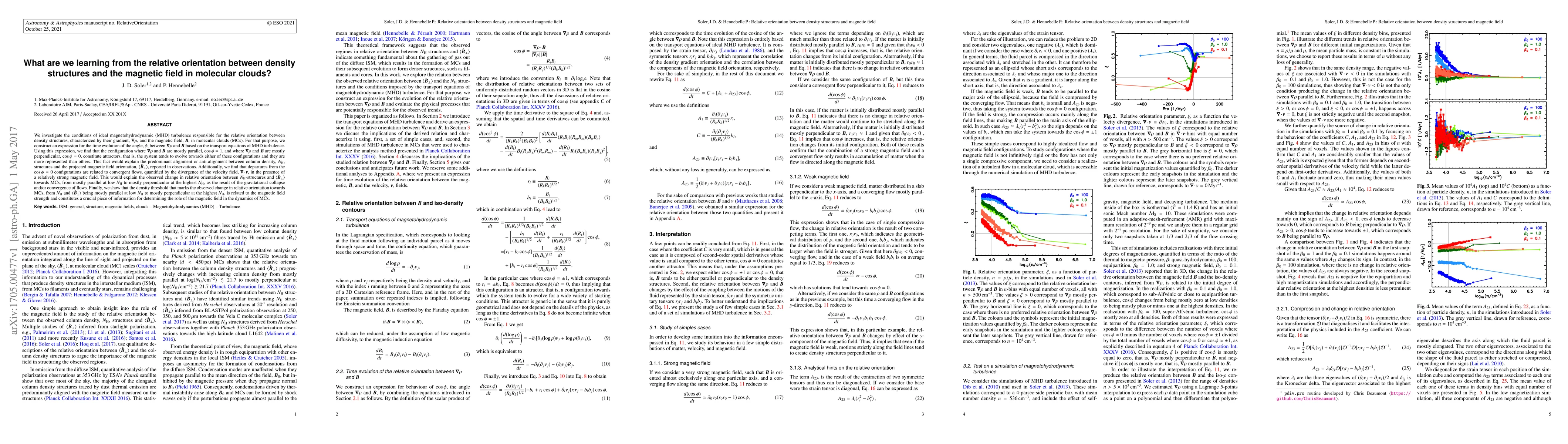 We investigate the conditions of ideal magnetohydrodynamic (MHD) turbulence responsible for the relative orientation between density structures, characterized by their gradient, $\vec{\nabla}\rho$, and the magnetic field, $\vec{B}$, in molecular clouds (MCs). For that purpose, we construct an expression for the time evolution of the angle, $\phi$, between $\vec{\nabla}\rho$ and $\vec{B}$ based on the transport equations of MHD turbulence. Using this expression, we find that the configuration where $\vec{\nabla}\rho$ and $\vec{B}$ are mostly parallel, $\cos\phi=1$, and where $\vec{\nabla}\rho$ and $\vec{B}$ are mostly perpendicular, $\cos\phi=0$, constitute attractors, that is, the system tends to evolve towards either of these configurations and they are more represented than others. This fact would explain the predominant alignment or anti-alignment between column density, $N_H$, structures and the projected magnetic field orientation, $\hat{B}_\perp$, reported in observations. Additionally, we find that departures from the $\cos\phi=0$ configurations are related to convergent flows, quantified by the divergence of the velocity field, $\vec{\nabla}\cdot\vec{v}$, in the presence of a relatively strong magnetic field. This would explain the observed change in relative orientation between $N_H$-structures and $\hat{B}_\perp$ towards MCs, from mostly parallel at low $N_H$ to mostly perpendicular at the highest $N_H$, as the result of the gravitational collapse and/or convergence of flows. Finally, we show that the density threshold that marks the observed change in relative orientation towards MCs, from $N_H$ and $\hat{B}_\perp$ being mostly parallel at low $N_H$ to mostly perpendicular at the highest $N_H$, is related to the magnetic field strength and constitutes a crucial piece of information for determining the role of the magnetic field in the dynamics of MCs.