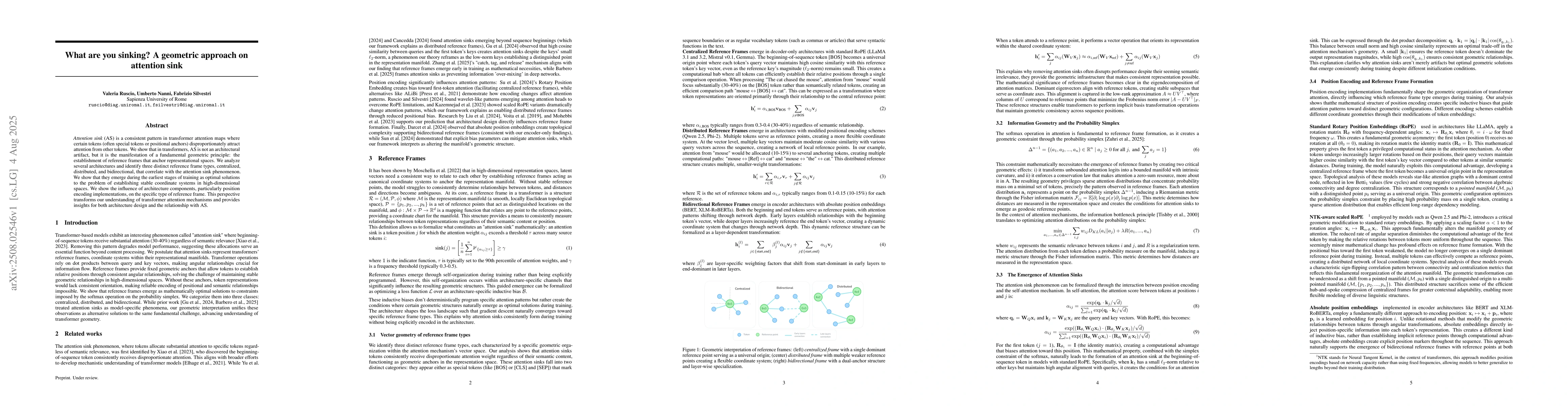 The paper introduces a geometric perspective on attention sinks, revealing that they are manifestations of reference frame establishment in transformer architectures.
